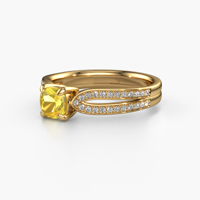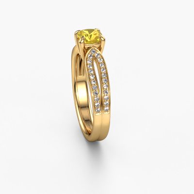 Der oben gezeigte Gold Verlobungsring wird Antonia cus 2 genannt. Es ist ein Pavé Solitär Ring, da er einen zentralen Edelstein und ein Band mit Pavé-Fassung hat. Der Fantasie Pavé Solitär Verlobungsring ist in der Kombination 14 Karat Gold mit Gold und ist mit einem cussion 5 mm Gelb Saphir-Mittelstein besetzt und das Band hat eine Pavé-Fassung mit Lab grown Diamant. Jedes Schmuckstück wird von unseren Meister-Goldschmieden in unserem eigenen Studio für Sie gefertigt. Um den zentralen Stein noch mehr zu betonen, hat das Band eine Pavé-Fassung mit weiteren Gelb Saphir. Durch die offenen Krappen kann das Licht aus mehreren Winkeln auf den Gelb Saphir treffen und der Gelb Saphir-Ring funkelt noch mehr. Das obere Foto zeigt die leidenschaftlich handgefertigten Details des Rings. Die hohe Positionierung der Mittelstein ist ein echter Blickfang. Der perfekte Verlobungsring für das Kronjuwel Ihres Lebens!Mit unserer modernen Technik können wir Schmuckstücke von höchster Qualität mit größter Sorgfalt für Sie entwerfen und anpassen. Unsere Verlobungsringe sind immer um 30 Prozent günstiger als bei anderen Juwelieren. Wir fertigen Verlobungsringe auf Bestellung, also müssen wir keine großen Lager unterhalten. Wenn Sie ein bestimmtes Budget haben, beraten wir Sie gerne entsprechend.Haben Sie irgendwo einen bestimmten Verlobungsring gefunden, den Sie Ihrem Liebsten schenken möchten? Sie können uns gerne sagen, was Sie wollen und wir werden Ihr Design in einen Einzigartigen Fantasie Verlobungsring verwandeln. Sie können die Entwicklungen Ihres Ringdesigns verfolgen, da wir 3D-Zeichnungen verwenden. Das gibt Ihnen eine realistische Vorschau, wie Ihr Design aussehen wird. Sie können auch einen Dummy vorbestellen. Ein Dummy ist ein Kunststoffring, der nach Ihrem Ringdesign gestaltet werden kann. Sie können ihn anprobieren und prüfen, ob seine Breite und Größe für Sie geeignet sind. Wir senden Ihnen gerne ein unverbindliches Angebot zu einem fairen Preis/Leistungsverhältnis. Sie werden in Anbetracht der Qualität des Rings und der Edelsteine überrascht sein.Um es einfacher zu machen, bieten wir eine kostenlose 30-tägige Rücksendung.