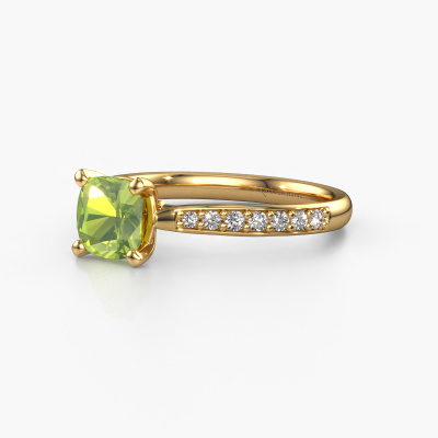 Der oben gezeigte Gold Verlobungsring wird Mignon cus 2 genannt. Es ist ein Pavé Solitär Ring, da er einen zentralen Edelstein und ein Band mit Pavé-Fassung hat. Der exklusive Pavé Solitär Verlobungsring ist in der Kombination 14 Karat Gold mit Gold und ist mit einem cussion 6 mm Peridot-Mittelstein besetzt und das Band hat eine Pavé-Fassung mit Lab grown Diamant. Jedes Schmuckstück wird hergestellt mit Leidenschaft und Liebe, von einem unserer Meister-Goldschmiede. Um den zentralen Stein noch mehr zu betonen, hat das Band eine Pavé-Fassung mit weiteren Peridot. Durch die offenen Krappen kann das Licht aus mehreren Winkeln auf den Peridot treffen und der Peridot-Ring funkelt noch mehr. Das obere Foto zeigt die leidenschaftlich handgefertigten Details des Rings. Die hohe Positionierung der Mittelstein ist ein echter Blickfang. Der perfekte Verlobungsring für das Kronjuwel Ihres Lebens!Nachdem Sie Ihre Bestellung aufgegeben haben, beginnen unsere Goldschmiede mit dem kreativen Prozess der Herstellung Ihres Mignon cus 2 Verlobungsring. Wir haben keine Lager. Das ist vorteilhaft, da diese Kosten nicht an Sie weitergegeben werden. Daher sind wir in der Lage, Schmuck zu außergewöhnlich niedrigen Preisen anzubieten.Unser Team fügt unserer Online-Kollektion täglich neue Designs hinzu. Unsere Designer und Goldschmiede arbeiten zusammen, um das beste Design zu kreieren. Wir bemühen uns, eine vielfältige Kollektion von Schmuckstücken anzubieten. Vielleicht haben Sie ein bestimmtes Design im Sinn. Eines, dass Sie irgendwo gesehen haben. Gerne geben wir Ihnen eine kostenlose Beratung. Wir machen Ihnen ein Angebot, basierend auf einem fairen Preis/Leistungsverhältnis, das Sie verblüffen wird.Um es einfacher zu machen, bieten wir eine kostenlose 30-tägige Rücksendung.