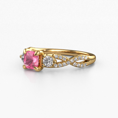 Der oben gezeigte Gold Verlobungsring wird Marilou CUS genannt. Es ist ein 3-stone Ring, da er einen zentralen Edelstein und ein Band mit Pavé-Fassung hat. Der traditionell 3-stone Verlobungsring ist in der Kombination 14 Karat Gold mit Gold und ist mit einem cussion 5 mm Pink Saphir-Mittelstein besetzt und das Band hat eine Pavé-Fassung mit Diamanten. Jedes Schmuckstück ist einzigartig in jeder Hinsicht! Einfach nach Ihren Wünschen anzupassen. Um den zentralen Stein noch mehr zu betonen, hat das Band eine Pavé-Fassung mit weiteren Pink Saphir. Durch die offenen Krappen kann das Licht aus mehreren Winkeln auf den Pink Saphir treffen und der Pink Saphir-Ring funkelt noch mehr. Das obere Foto zeigt die leidenschaftlich handgefertigten Details des Rings. Die hohe Positionierung der Mittelstein ist ein echter Blickfang. Der perfekte Verlobungsring für das Kronjuwel Ihres Lebens!Durch die Kombination modernster Technik mit uralter Handwerkskunst können wir alle Verlobungsringe in unserem eigenen Studio anfertigen. Jedes Schmuckstück wird auf Anfrage gefertigt. Das ist vorteilhaft, weil wir Ihnen dadurch einen Preis anbieten können, den Sie nirgendwo anders finden.Unser Team fügt unserer Online-Kollektion täglich neue Designs hinzu. Unsere Designer und Goldschmiede arbeiten zusammen, um das beste Design zu kreieren. Wir bemühen uns, eine vielfältige Kollektion von Schmuckstücken anzubieten. Vielleicht haben Sie ein bestimmtes Design im Sinn. Eines, dass Sie irgendwo gesehen haben. Gerne geben wir Ihnen eine kostenlose Beratung. Wir machen Ihnen ein Angebot, basierend auf einem fairen Preis/Leistungsverhältnis, das Sie verblüffen wird.Um es einfacher zu machen, bieten wir eine kostenlose 30-tägige Rücksendung.