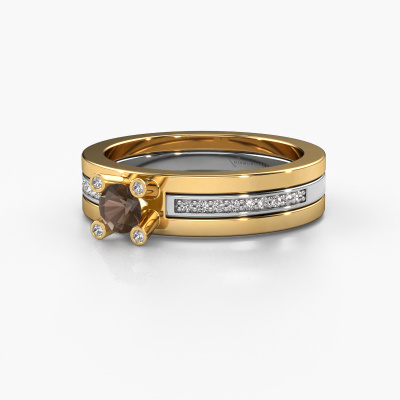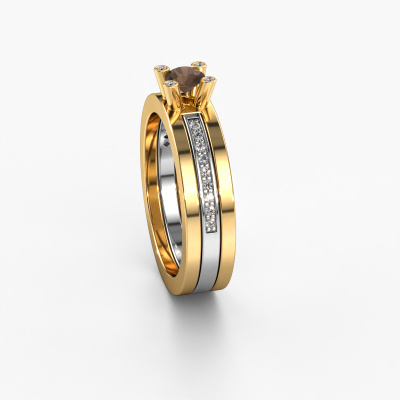 Der oben gezeigte Gold Verlobungsring wird Alisha genannt. Es ist ein Pavé Solitär Ring, da er einen zentralen Edelstein und ein Band mit Pavé-Fassung hat. Der design Pavé Solitär Verlobungsring ist in der Kombination 14 Karat Gold mit Weißgold und ist mit einem rund 4 mm Rauchquarz-Mittelstein besetzt und das Band hat eine Pavé-Fassung mit Diamanten. Jedes Schmuckstück ist einzigartig in jeder Hinsicht! Einfach nach Ihren Wünschen anzupassen. Um den zentralen Stein noch mehr zu betonen, hat das Band eine Pavé-Fassung mit weiteren Rauchquarz. Durch die offenen Krappen kann das Licht aus mehreren Winkeln auf den Rauchquarz treffen und der Rauchquarz-Ring funkelt noch mehr. Das obere Foto zeigt die leidenschaftlich handgefertigten Details des Rings. Die hohe Positionierung der Mittelstein ist ein echter Blickfang. Der perfekte Verlobungsring für das Kronjuwel Ihres Lebens!Durch die Kombination modernster Technik mit uralter Handwerkskunst können wir alle Verlobungsringe in unserem eigenen Studio anfertigen. Jedes Schmuckstück wird auf Anfrage gefertigt. Das ist vorteilhaft, weil wir Ihnen dadurch einen Preis anbieten können, den Sie nirgendwo anders finden.Haben Sie irgendwo einen bestimmten Verlobungsring gefunden, den Sie Ihrem Liebsten schenken möchten? Sie können uns gerne sagen, was Sie wollen und wir werden Ihr Design in einen Einzigartigen design Verlobungsring verwandeln. Sie können die Entwicklungen Ihres Ringdesigns verfolgen, da wir 3D-Zeichnungen verwenden. Das gibt Ihnen eine realistische Vorschau, wie Ihr Design aussehen wird. Sie können auch einen Dummy vorbestellen. Ein Dummy ist ein Kunststoffring, der nach Ihrem Ringdesign gestaltet werden kann. Sie können ihn anprobieren und prüfen, ob seine Breite und Größe für Sie geeignet sind. Wir senden Ihnen gerne ein unverbindliches Angebot zu einem fairen Preis/Leistungsverhältnis. Sie werden in Anbetracht der Qualität des Rings und der Edelsteine überrascht sein.Um es einfacher zu machen, bieten wir eine kostenlose 30-tägige Rücksendung.
