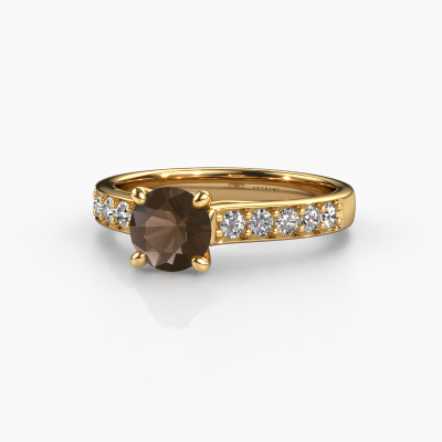 Der oben gezeigte Gold Verlobungsring wird Valorie RND 2 genannt. Es ist ein Pavé Solitär Ring, da er einen zentralen Edelstein und ein Band mit Pavé-Fassung hat. Der moderne Pavé Solitär Verlobungsring ist in der Kombination 14 Karat Gold mit Gold und ist mit einem rund 6.5 mm Rauchquarz-Mittelstein besetzt und das Band hat eine Pavé-Fassung mit Lab grown Diamant. Jedes Schmuckstück wird nur für Sie persönlich hergestellt, mit Liebe zum Detail und Design. Um den zentralen Stein noch mehr zu betonen, hat das Band eine Pavé-Fassung mit weiteren Rauchquarz. Durch die offenen Krappen kann das Licht aus mehreren Winkeln auf den Rauchquarz treffen und der Rauchquarz-Ring funkelt noch mehr. Das obere Foto zeigt die leidenschaftlich handgefertigten Details des Rings. Die hohe Positionierung der Mittelstein ist ein echter Blickfang. Der perfekte Verlobungsring für das Kronjuwel Ihres Lebens!Mit unserer modernen Technik können wir Schmuckstücke von höchster Qualität mit größter Sorgfalt für Sie entwerfen und anpassen. Unsere Verlobungsringe sind immer um 30 Prozent günstiger als bei anderen Juwelieren. Wir fertigen Verlobungsringe auf Bestellung, also müssen wir keine großen Lager unterhalten. Wenn Sie ein bestimmtes Budget haben, beraten wir Sie gerne entsprechend.Unsere Designer und Goldschmiede arbeiten jeden Tag zusammen und versuchen, neue Schmuckstücke zu kreieren. Vielleicht haben Sie irgendwo einen schönen, moderne Verlobungsring gefunden, nach dem Ihr einzigartiger Ring gestaltet werden kann. Setzen Sie sich mit uns in Verbindung. Wir machen Ihnen ein Angebot, basierend auf einem fairen Preis/Leistungsverhältnis, das Sie begeistern wird.Um es einfacher zu machen, bieten wir eine kostenlose 30-tägige Rücksendung.