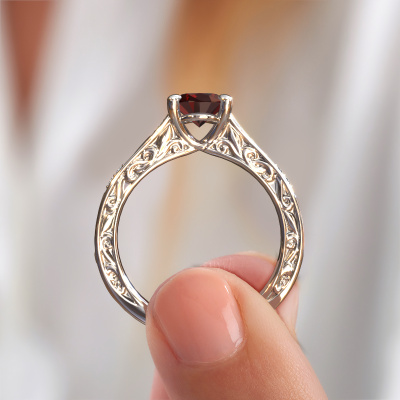 Der oben gezeigte Ring wird Mallory ovl genannt. Es ist ein Pavé Solitär Ring, da er einen zentralen Edelstein und ein Band mit Pavé-Fassung hat. Dieser Platin ring ist mit einem 8x6 mm oval Granat-Mittelstein besetzt und das Band hat eine Pavé-Fassung mit Lab grown Diamant. Jedes Schmuckstück wird hergestellt mit Leidenschaft und Liebe, von einem unserer Meister-Goldschmiede.Dieser traditionell Platin Pavé Solitär Verlobungsring mit Pavé-Fassung hat einen exquisiten, oval Granat als Mittelstein. Um den zentralen Stein noch mehr zu betonen, hat das Band eine Pavé-Fassung mit weiteren Lab grown Diamant. Durch die offenen Krappen kann das Licht aus mehreren Winkeln auf den Granat treffen und der Granat-Ring funkelt noch mehr. Das obere Foto zeigt die leidenschaftlich handgefertigten Details des Rings. Die hohe Positionierung der Mittelstein ist ein echter Blickfang. Der perfekte Verlobungsring für das Kronjuwel Ihres Lebens!Haben Sie ein bestimmtes Budget? Sie können uns gerne kontaktieren, damit wir Ihre Optionen besprechen können. Wir bieten unsere Verlobungsringe zum garantiert besten Preis, denn wir fertigen sie auf Bestellung. Solche Preise finden Sie nirgendwo anders!Unser Team fügt unserer Online-Kollektion täglich neue Designs hinzu. Unsere Designer und Goldschmiede arbeiten zusammen, um das beste Design zu kreieren. Wir bemühen uns, eine vielfältige Kollektion von Schmuckstücken anzubieten. Vielleicht haben Sie ein bestimmtes Design im Sinn. Eines, dass Sie irgendwo gesehen haben. Gerne geben wir Ihnen eine kostenlose Beratung. Wir machen Ihnen ein Angebot, basierend auf einem fairen Preis/Leistungsverhältnis, das Sie verblüffen wird.Um es einfacher zu machen, bieten wir eine kostenlose 30-tägige Rücksendung.