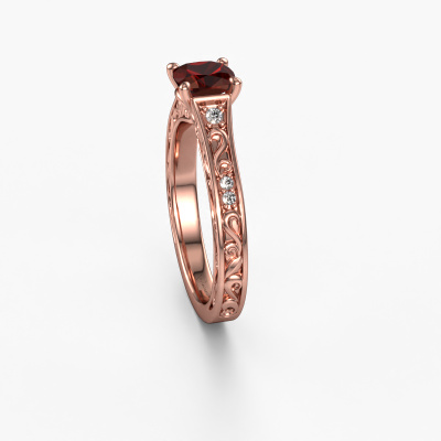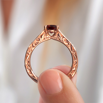 Der oben gezeigte Ring wird Mallory cus genannt. Es ist ein Pavé Solitär Ring, da er einen zentralen Edelstein und ein Band mit Pavé-Fassung hat. Dieser 14 Karat Roségold ring ist mit einem 5.5 mm cussion Granat-Mittelstein besetzt und das Band hat eine Pavé-Fassung mit Diamanten. Jedes Schmuckstück wird von unseren Meister-Goldschmieden in unserem eigenen Studio für Sie gefertigt.Dieser Keltische Roségold Pavé Solitär Verlobungsring mit Pavé-Fassung hat einen exquisiten, cussion Granat als Mittelstein. Um den zentralen Stein noch mehr zu betonen, hat das Band eine Pavé-Fassung mit weiteren Diamanten. Durch die offenen Krappen kann das Licht aus mehreren Winkeln auf den Granat treffen und der Granat-Ring funkelt noch mehr. Das obere Foto zeigt die leidenschaftlich handgefertigten Details des Rings. Die hohe Positionierung der Mittelstein ist ein echter Blickfang. Der perfekte Verlobungsring für das Kronjuwel Ihres Lebens!Mit unserer modernen Technik können wir Schmuckstücke von höchster Qualität mit größter Sorgfalt für Sie entwerfen und anpassen. Unsere Verlobungsringe sind immer um 30 Prozent günstiger als bei anderen Juwelieren. Wir fertigen Verlobungsringe auf Bestellung, also müssen wir keine großen Lager unterhalten. Wenn Sie ein bestimmtes Budget haben, beraten wir Sie gerne entsprechend.Verschiedene Arten von neuen Ringen werden täglich von unserem Team angefertigt. Vielleicht haben Sie irgendwo einen Pavé Solitär Verlobungsring gefunden. Einen, den Sie Ihrem Liebsten schenken möchten. Bitte zögern Sie nicht, unseren Schmuckdesignern Ihre Gedanken und Ihr Design zu zeigen. Wir würden gerne Ihr Design in einen Keltische Verlobungsring verwandeln. Sie können die Entwicklungen Ihres Ringdesigns verfolgen, da wir sehr detaillierte 3D-Zeichnungen verwenden. Darüber hinaus können Sie einen Dummy des Designs bestellen. Ein Dummy ist ein Kunststoffring, der nach Ihrem Ringdesign gestaltet werden kann. Sie können ihn anprobieren und prüfen, ob der Verlobungsring Ihren Vorstellungen entspricht. Wir senden Ihnen gerne ein unverbindliches Angebot zu einem fairen Preis/Leistungsverhältnis. Das Angebot wird Sie angesichts der Qualität des Rings und der Edelsteine verblüffen.Um es einfacher zu machen, bieten wir eine kostenlose 30-tägige Rücksendung.