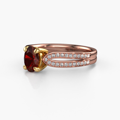 Der oben gezeigte Roségold Verlobungsring wird Antonia ovl 2 genannt. Es ist ein Pavé Solitär Ring, da er einen zentralen Edelstein und ein Band mit Pavé-Fassung hat. Der moderne Pavé Solitär Verlobungsring ist in der Kombination 14 Karat Roségold mit Gold und ist mit einem oval 7x5 mm Granat-Mittelstein besetzt und das Band hat eine Pavé-Fassung mit Diamanten. Jedes Schmuckstück ist einzigartig in jeder Hinsicht! Einfach nach Ihren Wünschen anzupassen. Um den zentralen Stein noch mehr zu betonen, hat das Band eine Pavé-Fassung mit weiteren Granat. Durch die offenen Krappen kann das Licht aus mehreren Winkeln auf den Granat treffen und der Granat-Ring funkelt noch mehr. Das obere Foto zeigt die leidenschaftlich handgefertigten Details des Rings. Die hohe Positionierung der Mittelstein ist ein echter Blickfang. Der perfekte Verlobungsring für das Kronjuwel Ihres Lebens!Durch die Kombination modernster Technik mit uralter Handwerkskunst können wir alle Verlobungsringe in unserem eigenen Studio anfertigen. Jedes Schmuckstück wird auf Anfrage gefertigt. Das ist vorteilhaft, weil wir Ihnen dadurch einen Preis anbieten können, den Sie nirgendwo anders finden.Unser Team fügt unserer Online-Kollektion täglich neue Designs hinzu. Unsere Designer und Goldschmiede arbeiten zusammen, um das beste Design zu kreieren. Wir bemühen uns, eine vielfältige Kollektion von Schmuckstücken anzubieten. Vielleicht haben Sie ein bestimmtes Design im Sinn. Eines, dass Sie irgendwo gesehen haben. Gerne geben wir Ihnen eine kostenlose Beratung. Wir machen Ihnen ein Angebot, basierend auf einem fairen Preis/Leistungsverhältnis, das Sie verblüffen wird.Um es einfacher zu machen, bieten wir eine kostenlose 30-tägige Rücksendung.