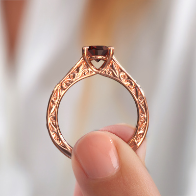 Der oben gezeigte Ring wird Mallory ovl genannt. Es ist ein Pavé Solitär Ring, da er einen zentralen Edelstein und ein Band mit Pavé-Fassung hat. Dieser 14 Karat Roségold ring ist mit einem 8x6 mm oval Granat-Mittelstein besetzt und das Band hat eine Pavé-Fassung mit Lab grown Diamant. Jedes Schmuckstück wird hergestellt mit Leidenschaft und Liebe, von einem unserer Meister-Goldschmiede.Dieser traditionell Roségold Pavé Solitär Verlobungsring mit Pavé-Fassung hat einen exquisiten, oval Granat als Mittelstein. Um den zentralen Stein noch mehr zu betonen, hat das Band eine Pavé-Fassung mit weiteren Lab grown Diamant. Durch die offenen Krappen kann das Licht aus mehreren Winkeln auf den Granat treffen und der Granat-Ring funkelt noch mehr. Das obere Foto zeigt die leidenschaftlich handgefertigten Details des Rings. Die hohe Positionierung der Mittelstein ist ein echter Blickfang. Der perfekte Verlobungsring für das Kronjuwel Ihres Lebens!Haben Sie ein bestimmtes Budget? Sie können uns gerne kontaktieren, damit wir Ihre Optionen besprechen können. Wir bieten unsere Verlobungsringe zum garantiert besten Preis, denn wir fertigen sie auf Bestellung. Solche Preise finden Sie nirgendwo anders!Unser Team fügt unserer Online-Kollektion täglich neue Designs hinzu. Unsere Designer und Goldschmiede arbeiten zusammen, um das beste Design zu kreieren. Wir bemühen uns, eine vielfältige Kollektion von Schmuckstücken anzubieten. Vielleicht haben Sie ein bestimmtes Design im Sinn. Eines, dass Sie irgendwo gesehen haben. Gerne geben wir Ihnen eine kostenlose Beratung. Wir machen Ihnen ein Angebot, basierend auf einem fairen Preis/Leistungsverhältnis, das Sie verblüffen wird.Um es einfacher zu machen, bieten wir eine kostenlose 30-tägige Rücksendung.