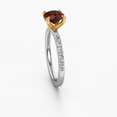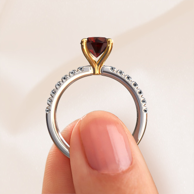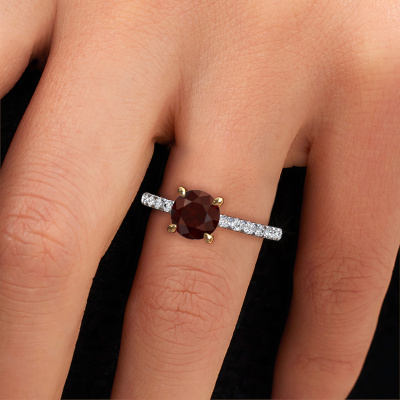 Der oben gezeigte Weißgold Verlobungsring wird Crystal RND 2 genannt. Es ist ein Pavé Solitär Ring, da er einen zentralen Edelstein und ein Band mit Pavé-Fassung hat. Der klassische Pavé Solitär Verlobungsring ist in der Kombination 14 Karat Weißgold mit Gold und ist mit einem rund 7 mm Granat-Mittelstein besetzt und das Band hat eine Pavé-Fassung mit Lab grown Diamant. Jedes Schmuckstück ist einzigartig in jeder Hinsicht! Einfach nach Ihren Wünschen anzupassen. Um den zentralen Stein noch mehr zu betonen, hat das Band eine Pavé-Fassung mit weiteren Granat. Durch die offenen Krappen kann das Licht aus mehreren Winkeln auf den Granat treffen und der Granat-Ring funkelt noch mehr. Das obere Foto zeigt die leidenschaftlich handgefertigten Details des Rings. Die hohe Positionierung der Mittelstein ist ein echter Blickfang. Der perfekte Verlobungsring für das Kronjuwel Ihres Lebens!Nachdem Sie Ihre Bestellung aufgegeben haben, beginnen unsere Goldschmiede mit dem kreativen Prozess der Herstellung Ihres Crystal RND 2 Verlobungsring. Wir haben keine Lager. Das ist vorteilhaft, da diese Kosten nicht an Sie weitergegeben werden. Daher sind wir in der Lage, Schmuck zu außergewöhnlich niedrigen Preisen anzubieten.Verschiedene Arten von neuen Ringen werden täglich von unserem Team angefertigt. Vielleicht haben Sie irgendwo einen Pavé Solitär Verlobungsring gefunden. Einen, den Sie Ihrem Liebsten schenken möchten. Bitte zögern Sie nicht, unseren Schmuckdesignern Ihre Gedanken und Ihr Design zu zeigen. Wir würden gerne Ihr Design in einen klassische Verlobungsring verwandeln. Sie können die Entwicklungen Ihres Ringdesigns verfolgen, da wir sehr detaillierte 3D-Zeichnungen verwenden. Darüber hinaus können Sie einen Dummy des Designs bestellen. Ein Dummy ist ein Kunststoffring, der nach Ihrem Ringdesign gestaltet werden kann. Sie können ihn anprobieren und prüfen, ob der Verlobungsring Ihren Vorstellungen entspricht. Wir senden Ihnen gerne ein unverbindliches Angebot zu einem fairen Preis/Leistungsverhältnis. Das Angebot wird Sie angesichts der Qualität des Rings und der Edelsteine verblüffen.Um es einfacher zu machen, bieten wir eine kostenlose 30-tägige Rücksendung.