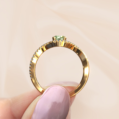 Der oben gezeigte Ring wird Melody genannt. Es ist ein Pavé Solitär Ring, da er einen zentralen Edelstein und ein Band mit Pavé-Fassung hat. Dieser 14 Karat Gold ring ist mit einem 5 mm rund grüner Labor-Diamant-Mittelstein besetzt und das Band hat eine Pavé-Fassung mit Diamanten. Jedes Schmuckstück ist einzigartig in jeder Hinsicht! Einfach nach Ihren Wünschen anzupassen.Dieser klassische Gold Pavé Solitär Verlobungsring mit Pavé-Fassung hat einen exquisiten, rund grüner Labor-Diamant als Mittelstein. Um den zentralen Stein noch mehr zu betonen, hat das Band eine Pavé-Fassung mit weiteren Diamanten. Durch die offenen Krappen kann das Licht aus mehreren Winkeln auf den grüner Labor-Diamant treffen und der grüner Labor-Diamant-Ring funkelt noch mehr. Das obere Foto zeigt die leidenschaftlich handgefertigten Details des Rings. Die hohe Positionierung der Mittelstein ist ein echter Blickfang. Der perfekte Verlobungsring für das Kronjuwel Ihres Lebens!Da wir unsere eigenen Ringe entwerfen und liefern, können wir Ihnen einen Verlobungsring zu einem Preis anbieten, den Sie nirgendwo anders finden. Ein Ring wird auf Bestellung angefertigt, wodurch kein überschüssiges Material anfällt. So können wir Ihnen ein gutes Angebot zum besten Preis machen. Wir verstehen, dass es sich riskant anfühlt, Ihren Verlobungsring online zu kaufen. Jedoch helfen wir Ihnen gerne beim Designprozess unter Berücksichtigung Ihres Budgets.Haben Sie einen bestimmten Ring im Sinn? Eines, dass Sie irgendwo gesehen haben. Bitte zögern Sie nicht, uns zu sagen, was Sie wollen und wir werden Ihr Design in einen Einzigartigen Verlobungsring verwandeln. Sie können die Entwicklungen Ihres Ringdesigns verfolgen, da wir 3D-Zeichnungen verwenden. Das gibt Ihnen eine realistische Vorschau Ihres Designs. Wir senden Ihnen gerne ein unverbindliches Angebot zu einem fairen Preis/Leistungsverhältnis. Es wird Sie erstaunen.Um es einfacher zu machen, bieten wir eine kostenlose 30-tägige Rücksendung.