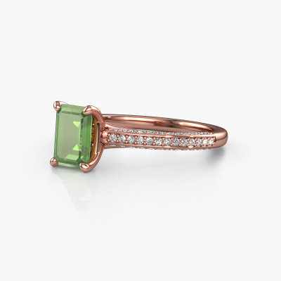 Der oben gezeigte Ring wird Elenore eme genannt. Es ist ein Pavé Solitär Ring, da er einen zentralen Edelstein und ein Band mit Pavé-Fassung hat. Dieser 14 Karat Roségold ring ist mit einem 7x5 mm smaragd schliff Turmalin grün-Mittelstein besetzt und das Band hat eine Pavé-Fassung mit Lab grown Diamant. Jedes Schmuckstück wird nur für Sie persönlich hergestellt, mit Liebe zum Detail und Design.Dieser exklusive Roségold Pavé Solitär Verlobungsring mit Pavé-Fassung hat einen exquisiten, smaragd schliff Turmalin grün als Mittelstein. Um den zentralen Stein noch mehr zu betonen, hat das Band eine Pavé-Fassung mit weiteren Lab grown Diamant. Durch die offenen Krappen kann das Licht aus mehreren Winkeln auf den Turmalin grün treffen und der Turmalin grün-Ring funkelt noch mehr. Das obere Foto zeigt die leidenschaftlich handgefertigten Details des Rings. Die hohe Positionierung der Mittelstein ist ein echter Blickfang. Der perfekte Verlobungsring für das Kronjuwel Ihres Lebens!Haben Sie ein bestimmtes Budget? Sie können uns gerne kontaktieren, damit wir Ihre Optionen besprechen können. Wir bieten unsere Verlobungsringe zum garantiert besten Preis, denn wir fertigen sie auf Bestellung. Solche Preise finden Sie nirgendwo anders!Haben Sie irgendwo einen bestimmten Verlobungsring gefunden, den Sie Ihrem Liebsten schenken möchten? Sie können uns gerne sagen, was Sie wollen und wir werden Ihr Design in einen Einzigartigen exklusive Verlobungsring verwandeln. Sie können die Entwicklungen Ihres Ringdesigns verfolgen, da wir 3D-Zeichnungen verwenden. Das gibt Ihnen eine realistische Vorschau, wie Ihr Design aussehen wird. Sie können auch einen Dummy vorbestellen. Ein Dummy ist ein Kunststoffring, der nach Ihrem Ringdesign gestaltet werden kann. Sie können ihn anprobieren und prüfen, ob seine Breite und Größe für Sie geeignet sind. Wir senden Ihnen gerne ein unverbindliches Angebot zu einem fairen Preis/Leistungsverhältnis. Sie werden in Anbetracht der Qualität des Rings und der Edelsteine überrascht sein.Um es einfacher zu machen, bieten wir eine kostenlose 30-tägige Rücksendung.