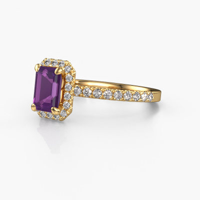 Der oben gezeigte Verlobungsring wird Miranda eme genannt. Es ist ein Halo Ring, da er einen zentralen Edelstein und ein Band mit Pavé-Fassung hat. Der 14 Karat Gold ring ist mit einem 7x5 mm smaragd schliff Amethyst-Mittelstein besetzt und um ihn herum eine Pavé-Fassung mit Diamanten. Was diesen klassische, Gold Halo Ring besonders macht, sind die kleineren Steine, die den zentralen Stein umschließen. Dieser wunderschöne Verlobungsring wird als Halo Ring bezeichnet, da die kleineren Edelsteine dem zentralen Stein einen Lichthof geben. Damit die kleineren Steine den Mittelstein verstärken, müssen sie so platziert werden, dass keine Lichteinflüsse auftreten. Und hier kommen unsere erfahrenen Goldschmiede ins Spiel. Jeder einzelne Stein wird sorgfältig von Hand in den Ring gesetzt. Während der Herstellung wird der Lichteinfall ständig überprüft. So können wir sicherstellen, dass der spezielle Lichtkranz noch sichtbar ist. Am Ende erhalten Sie einen einzigartigen Verlobungsring mit einem Amethysten Ihrer Wahl in der Mitte. Sie können sich die Wirkung eines solchen Ringes vorstellen, wenn Sie ihn an ihrem besonderen Tag für sie zum Leuchten bringen. Durch die Kombination modernster Technik mit uralter Handwerkskunst können wir alle Verlobungsringe in unserem eigenen Studio anfertigen. Jedes Schmuckstück wird auf Anfrage gefertigt. Das ist vorteilhaft, weil wir Ihnen dadurch einen Preis anbieten können, den Sie nirgendwo anders finden.Unsere Designer und Goldschmiede arbeiten jeden Tag zusammen und versuchen, neue Schmuckstücke zu kreieren. Vielleicht haben Sie irgendwo einen schönen, klassische Verlobungsring gefunden, nach dem Ihr einzigartiger Ring gestaltet werden kann. Setzen Sie sich mit uns in Verbindung. Wir machen Ihnen ein Angebot, basierend auf einem fairen Preis/Leistungsverhältnis, das Sie begeistern wird.Um es einfacher zu machen, bieten wir eine kostenlose 30-tägige Rücksendung.