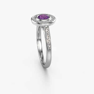 Der oben gezeigte Verlobungsring wird Noud 2 RND genannt. Es ist ein Halo Ring, da er einen zentralen Edelstein und ein Band mit Pavé-Fassung hat. Der Platin ring ist mit einem 5 mm rund Amethyst-Mittelstein besetzt und um ihn herum eine Pavé-Fassung mit Diamanten. Was diesen Luxus, Platin Halo Ring besonders macht, sind die kleineren Steine, die den zentralen Stein umschließen. Dieser wunderschöne Verlobungsring wird als Halo Ring bezeichnet, da die kleineren Edelsteine dem zentralen Stein einen Lichthof geben. Damit die kleineren Steine den Mittelstein verstärken, müssen sie so platziert werden, dass keine Lichteinflüsse auftreten. Und hier kommen unsere erfahrenen Goldschmiede ins Spiel. Jeder einzelne Stein wird sorgfältig von Hand in den Ring gesetzt. Während der Herstellung wird der Lichteinfall ständig überprüft. So können wir sicherstellen, dass der spezielle Lichtkranz noch sichtbar ist. Am Ende erhalten Sie einen einzigartigen Verlobungsring mit einem Amethysten Ihrer Wahl in der Mitte. Sie können sich die Wirkung eines solchen Ringes vorstellen, wenn Sie ihn an ihrem besonderen Tag für sie zum Leuchten bringen. Durch die Kombination modernster Technik mit uralter Handwerkskunst können wir alle Verlobungsringe in unserem eigenen Studio anfertigen. Jedes Schmuckstück wird auf Anfrage gefertigt. Das ist vorteilhaft, weil wir Ihnen dadurch einen Preis anbieten können, den Sie nirgendwo anders finden.Haben Sie irgendwo einen bestimmten Verlobungsring gefunden, den Sie Ihrem Liebsten schenken möchten? Sie können uns gerne sagen, was Sie wollen und wir werden Ihr Design in einen Einzigartigen Luxus Verlobungsring verwandeln. Sie können die Entwicklungen Ihres Ringdesigns verfolgen, da wir 3D-Zeichnungen verwenden. Das gibt Ihnen eine realistische Vorschau, wie Ihr Design aussehen wird. Sie können auch einen Dummy vorbestellen. Ein Dummy ist ein Kunststoffring, der nach Ihrem Ringdesign gestaltet werden kann. Sie können ihn anprobieren und prüfen, ob seine Breite und Größe für Sie geeignet sind. Wir senden Ihnen gerne ein unverbindliches Angebot zu einem fairen Preis/Leistungsverhältnis. Sie werden in Anbetracht der Qualität des Rings und der Edelsteine überrascht sein.Um es einfacher zu machen, bieten wir eine kostenlose 30-tägige Rücksendung.