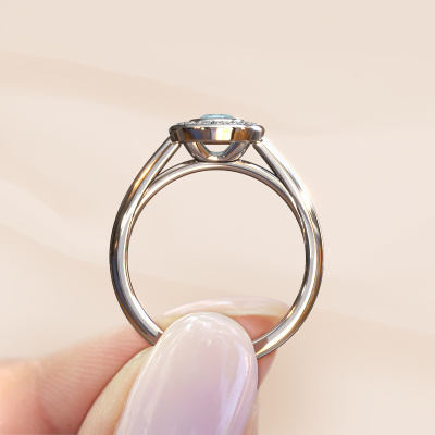Der oben gezeigte Verlobungsring wird Noud 1 OVL genannt. Es ist ein Halo Ring, da er einen zentralen Edelstein und ein Band mit Pavé-Fassung hat. Der Platin ring ist mit einem 6x4 mm oval Aquamarin-Mittelstein besetzt und um ihn herum eine Pavé-Fassung mit Lab grown Diamant. Was diesen klassische, Platin Halo Ring besonders macht, sind die kleineren Steine, die den zentralen Stein umschließen. Dieser wunderschöne Verlobungsring wird als Halo Ring bezeichnet, da die kleineren Edelsteine dem zentralen Stein einen Lichthof geben. Damit die kleineren Steine den Mittelstein verstärken, müssen sie so platziert werden, dass keine Lichteinflüsse auftreten. Und hier kommen unsere erfahrenen Goldschmiede ins Spiel. Jeder einzelne Stein wird sorgfältig von Hand in den Ring gesetzt. Während der Herstellung wird der Lichteinfall ständig überprüft. So können wir sicherstellen, dass der spezielle Lichtkranz noch sichtbar ist. Am Ende erhalten Sie einen einzigartigen Verlobungsring mit einem Aquamarins Ihrer Wahl in der Mitte. Sie können sich die Wirkung eines solchen Ringes vorstellen, wenn Sie ihn an ihrem besonderen Tag für sie zum Leuchten bringen. Durch die Kombination modernster Technik mit uralter Handwerkskunst können wir alle Verlobungsringe in unserem eigenen Studio anfertigen. Jedes Schmuckstück wird auf Anfrage gefertigt. Das ist vorteilhaft, weil wir Ihnen dadurch einen Preis anbieten können, den Sie nirgendwo anders finden.Unser Team fügt unserer Online-Kollektion täglich neue Designs hinzu. Unsere Designer und Goldschmiede arbeiten zusammen, um das beste Design zu kreieren. Wir bemühen uns, eine vielfältige Kollektion von Schmuckstücken anzubieten. Vielleicht haben Sie ein bestimmtes Design im Sinn. Eines, dass Sie irgendwo gesehen haben. Gerne geben wir Ihnen eine kostenlose Beratung. Wir machen Ihnen ein Angebot, basierend auf einem fairen Preis/Leistungsverhältnis, das Sie verblüffen wird.Um es einfacher zu machen, bieten wir eine kostenlose 30-tägige Rücksendung.