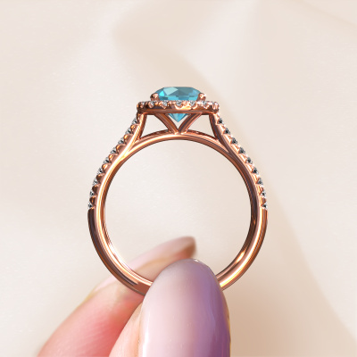 Der oben gezeigte Verlobungsring wird Seline rnd 2 genannt. Es ist ein Halo Ring, da er einen zentralen Edelstein und ein Band mit Pavé-Fassung hat. Der 14 Karat Roségold ring ist mit einem 6.5 mm rund Blau Topas-Mittelstein besetzt und um ihn herum eine Pavé-Fassung mit Lab grown Diamant. Was diesen exklusive, Roségold Halo Ring besonders macht, sind die kleineren Steine, die den zentralen Stein umschließen. Dieser wunderschöne Verlobungsring wird als Halo Ring bezeichnet, da die kleineren Edelsteine dem zentralen Stein einen Lichthof geben. Damit die kleineren Steine den Mittelstein verstärken, müssen sie so platziert werden, dass keine Lichteinflüsse auftreten. Und hier kommen unsere erfahrenen Goldschmiede ins Spiel. Jeder einzelne Stein wird sorgfältig von Hand in den Ring gesetzt. Während der Herstellung wird der Lichteinfall ständig überprüft. So können wir sicherstellen, dass der spezielle Lichtkranz noch sichtbar ist. Am Ende erhalten Sie einen einzigartigen Verlobungsring mit einem Blaue Topas Ihrer Wahl in der Mitte. Sie können sich die Wirkung eines solchen Ringes vorstellen, wenn Sie ihn an ihrem besonderen Tag für sie zum Leuchten bringen. Nachdem Sie Ihre Bestellung aufgegeben haben, beginnen unsere Goldschmiede mit dem kreativen Prozess der Herstellung Ihres Seline rnd 2 Verlobungsring. Wir haben keine Lager. Das ist vorteilhaft, da diese Kosten nicht an Sie weitergegeben werden. Daher sind wir in der Lage, Schmuck zu außergewöhnlich niedrigen Preisen anzubieten.Unser Team fügt unserer Online-Kollektion täglich neue Designs hinzu. Unsere Designer und Goldschmiede arbeiten zusammen, um das beste Design zu kreieren. Wir bemühen uns, eine vielfältige Kollektion von Schmuckstücken anzubieten. Vielleicht haben Sie ein bestimmtes Design im Sinn. Eines, dass Sie irgendwo gesehen haben. Gerne geben wir Ihnen eine kostenlose Beratung. Wir machen Ihnen ein Angebot, basierend auf einem fairen Preis/Leistungsverhältnis, das Sie verblüffen wird.Um es einfacher zu machen, bieten wir eine kostenlose 30-tägige Rücksendung.