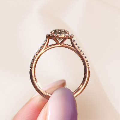 Der oben gezeigte Verlobungsring wird Seline rnd 2 genannt. Es ist ein Halo Ring, da er einen zentralen Edelstein und ein Band mit Pavé-Fassung hat. Der 14 Karat Roségold ring ist mit einem 1.00 crt rund Braun Diamant-Mittelstein besetzt und um ihn herum eine Pavé-Fassung mit Lab grown Diamant. Was diesen exklusive, Roségold Halo Ring besonders macht, sind die kleineren Steine, die den zentralen Stein umschließen. Dieser wunderschöne Verlobungsring wird als Halo Ring bezeichnet, da die kleineren Edelsteine dem zentralen Stein einen Lichthof geben. Damit die kleineren Steine den Mittelstein verstärken, müssen sie so platziert werden, dass keine Lichteinflüsse auftreten. Und hier kommen unsere erfahrenen Goldschmiede ins Spiel. Jeder einzelne Stein wird sorgfältig von Hand in den Ring gesetzt. Während der Herstellung wird der Lichteinfall ständig überprüft. So können wir sicherstellen, dass der spezielle Lichtkranz noch sichtbar ist. Am Ende erhalten Sie einen einzigartigen Verlobungsring mit einem Braune Diamanten Ihrer Wahl in der Mitte. Sie können sich die Wirkung eines solchen Ringes vorstellen, wenn Sie ihn an ihrem besonderen Tag für sie zum Leuchten bringen. Nachdem Sie Ihre Bestellung aufgegeben haben, beginnen unsere Goldschmiede mit dem kreativen Prozess der Herstellung Ihres Seline rnd 2 Verlobungsring. Wir haben keine Lager. Das ist vorteilhaft, da diese Kosten nicht an Sie weitergegeben werden. Daher sind wir in der Lage, Schmuck zu außergewöhnlich niedrigen Preisen anzubieten.Unser Team fügt unserer Online-Kollektion täglich neue Designs hinzu. Unsere Designer und Goldschmiede arbeiten zusammen, um das beste Design zu kreieren. Wir bemühen uns, eine vielfältige Kollektion von Schmuckstücken anzubieten. Vielleicht haben Sie ein bestimmtes Design im Sinn. Eines, dass Sie irgendwo gesehen haben. Gerne geben wir Ihnen eine kostenlose Beratung. Wir machen Ihnen ein Angebot, basierend auf einem fairen Preis/Leistungsverhältnis, das Sie verblüffen wird.Um es einfacher zu machen, bieten wir eine kostenlose 30-tägige Rücksendung.