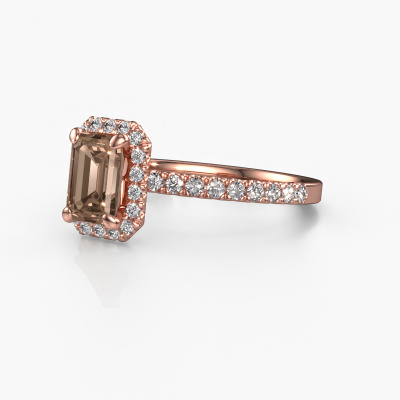 Der oben gezeigte Verlobungsring wird Miranda eme genannt. Es ist ein Halo Ring, da er einen zentralen Edelstein und ein Band mit Pavé-Fassung hat. Der 14 Karat Roségold ring ist mit einem 1.15 crt smaragd schliff Braun Diamant-Mittelstein besetzt und um ihn herum eine Pavé-Fassung mit Diamanten. Was diesen klassische, Roségold Halo Ring besonders macht, sind die kleineren Steine, die den zentralen Stein umschließen. Dieser wunderschöne Verlobungsring wird als Halo Ring bezeichnet, da die kleineren Edelsteine dem zentralen Stein einen Lichthof geben. Damit die kleineren Steine den Mittelstein verstärken, müssen sie so platziert werden, dass keine Lichteinflüsse auftreten. Und hier kommen unsere erfahrenen Goldschmiede ins Spiel. Jeder einzelne Stein wird sorgfältig von Hand in den Ring gesetzt. Während der Herstellung wird der Lichteinfall ständig überprüft. So können wir sicherstellen, dass der spezielle Lichtkranz noch sichtbar ist. Am Ende erhalten Sie einen einzigartigen Verlobungsring mit einem Braune Diamanten Ihrer Wahl in der Mitte. Sie können sich die Wirkung eines solchen Ringes vorstellen, wenn Sie ihn an ihrem besonderen Tag für sie zum Leuchten bringen. Durch die Kombination modernster Technik mit uralter Handwerkskunst können wir alle Verlobungsringe in unserem eigenen Studio anfertigen. Jedes Schmuckstück wird auf Anfrage gefertigt. Das ist vorteilhaft, weil wir Ihnen dadurch einen Preis anbieten können, den Sie nirgendwo anders finden.Unsere Designer und Goldschmiede arbeiten jeden Tag zusammen und versuchen, neue Schmuckstücke zu kreieren. Vielleicht haben Sie irgendwo einen schönen, klassische Verlobungsring gefunden, nach dem Ihr einzigartiger Ring gestaltet werden kann. Setzen Sie sich mit uns in Verbindung. Wir machen Ihnen ein Angebot, basierend auf einem fairen Preis/Leistungsverhältnis, das Sie begeistern wird.Um es einfacher zu machen, bieten wir eine kostenlose 30-tägige Rücksendung.