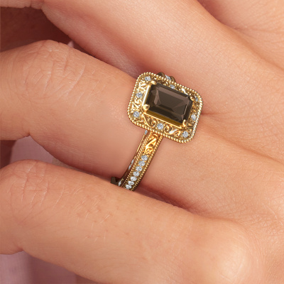 Dieser Verlobungsring aus 14 Karat Gold heißt Alice EME und hat einen 7x5 mm Rauchquarz. Ein außergewöhnlicher, Gold Vintage Ring. Einer, der die Liebe Ihres Lebens mit Sicherheit wie ein Rauchquarz erstrahlen lässt! Das hoffen wir zu erreichen. Dieser Vintage Verlobungsring ist mit exquisiten Rauchquarz besetzt. Welchen Edelstein Sie aus unserer Auswahl haben möchten, liegt ganz bei Ihnen. Der Edelstein wird mit großer Sorgfalt ausgewählt. Denn wir glauben, dass Ihr Perle Ränder Verlobungsring nur mit dem schönsten Edelstein gekrönt sein darf. Sehen Sie das auch so? Unser erfahrener Juwelier entwirft Ihren Ring in unserem eigenen Studio, wo der Rauchquarz mit großer Präzision eingefasst wird. Der Ring wird dann bearbeitet und poliert, bis er perfekt ist. Nichts als das Beste für die Liebe Ihres Lebens! Jedes Schmuckstück wird von unseren Meister-Goldschmieden in unserem eigenen Studio für Sie gefertigt.Durch die Kombination modernster Technik mit uralter Handwerkskunst können wir alle Verlobungsringe in unserem eigenen Studio anfertigen. Jedes Schmuckstück wird auf Anfrage gefertigt. Das ist vorteilhaft, weil wir Ihnen dadurch einen Preis anbieten können, den Sie nirgendwo anders finden.Haben Sie einen bestimmten Ring im Sinn? Eines, dass Sie irgendwo gesehen haben. Bitte zögern Sie nicht, uns zu sagen, was Sie wollen und wir werden Ihr Design in einen Einzigartigen Verlobungsring verwandeln. Sie können die Entwicklungen Ihres Ringdesigns verfolgen, da wir 3D-Zeichnungen verwenden. Das gibt Ihnen eine realistische Vorschau Ihres Designs. Wir senden Ihnen gerne ein unverbindliches Angebot zu einem fairen Preis/Leistungsverhältnis. Es wird Sie erstaunen.Um es einfacher zu machen, bieten wir eine kostenlose 30-tägige Rücksendung.
