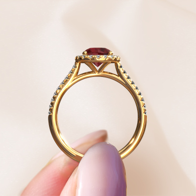 Der oben gezeigte Verlobungsring wird Seline rnd 2 genannt. Es ist ein Halo Ring, da er einen zentralen Edelstein und ein Band mit Pavé-Fassung hat. Der 14 Karat Gold ring ist mit einem 6.5 mm rund Rubin-Mittelstein besetzt und um ihn herum eine Pavé-Fassung mit Lab grown Diamant. Was diesen exklusive, Gold Halo Ring besonders macht, sind die kleineren Steine, die den zentralen Stein umschließen. Dieser wunderschöne Verlobungsring wird als Halo Ring bezeichnet, da die kleineren Edelsteine dem zentralen Stein einen Lichthof geben. Damit die kleineren Steine den Mittelstein verstärken, müssen sie so platziert werden, dass keine Lichteinflüsse auftreten. Und hier kommen unsere erfahrenen Goldschmiede ins Spiel. Jeder einzelne Stein wird sorgfältig von Hand in den Ring gesetzt. Während der Herstellung wird der Lichteinfall ständig überprüft. So können wir sicherstellen, dass der spezielle Lichtkranz noch sichtbar ist. Am Ende erhalten Sie einen einzigartigen Verlobungsring mit einem Rubin Ihrer Wahl in der Mitte. Sie können sich die Wirkung eines solchen Ringes vorstellen, wenn Sie ihn an ihrem besonderen Tag für sie zum Leuchten bringen. Nachdem Sie Ihre Bestellung aufgegeben haben, beginnen unsere Goldschmiede mit dem kreativen Prozess der Herstellung Ihres Seline rnd 2 Verlobungsring. Wir haben keine Lager. Das ist vorteilhaft, da diese Kosten nicht an Sie weitergegeben werden. Daher sind wir in der Lage, Schmuck zu außergewöhnlich niedrigen Preisen anzubieten.Unser Team fügt unserer Online-Kollektion täglich neue Designs hinzu. Unsere Designer und Goldschmiede arbeiten zusammen, um das beste Design zu kreieren. Wir bemühen uns, eine vielfältige Kollektion von Schmuckstücken anzubieten. Vielleicht haben Sie ein bestimmtes Design im Sinn. Eines, dass Sie irgendwo gesehen haben. Gerne geben wir Ihnen eine kostenlose Beratung. Wir machen Ihnen ein Angebot, basierend auf einem fairen Preis/Leistungsverhältnis, das Sie verblüffen wird.Um es einfacher zu machen, bieten wir eine kostenlose 30-tägige Rücksendung.