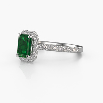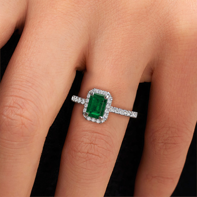 Der oben gezeigte Verlobungsring wird Miranda eme genannt. Es ist ein Halo Ring, da er einen zentralen Edelstein und ein Band mit Pavé-Fassung hat. Der Platin ring ist mit einem 7x5 mm smaragd schliff Smaragd-Mittelstein besetzt und um ihn herum eine Pavé-Fassung mit Diamanten. Was diesen klassische, Platin Halo Ring besonders macht, sind die kleineren Steine, die den zentralen Stein umschließen. Dieser wunderschöne Verlobungsring wird als Halo Ring bezeichnet, da die kleineren Edelsteine dem zentralen Stein einen Lichthof geben. Damit die kleineren Steine den Mittelstein verstärken, müssen sie so platziert werden, dass keine Lichteinflüsse auftreten. Und hier kommen unsere erfahrenen Goldschmiede ins Spiel. Jeder einzelne Stein wird sorgfältig von Hand in den Ring gesetzt. Während der Herstellung wird der Lichteinfall ständig überprüft. So können wir sicherstellen, dass der spezielle Lichtkranz noch sichtbar ist. Am Ende erhalten Sie einen einzigartigen Verlobungsring mit einem Smaragd Ihrer Wahl in der Mitte. Sie können sich die Wirkung eines solchen Ringes vorstellen, wenn Sie ihn an ihrem besonderen Tag für sie zum Leuchten bringen. Durch die Kombination modernster Technik mit uralter Handwerkskunst können wir alle Verlobungsringe in unserem eigenen Studio anfertigen. Jedes Schmuckstück wird auf Anfrage gefertigt. Das ist vorteilhaft, weil wir Ihnen dadurch einen Preis anbieten können, den Sie nirgendwo anders finden.Unsere Designer und Goldschmiede arbeiten jeden Tag zusammen und versuchen, neue Schmuckstücke zu kreieren. Vielleicht haben Sie irgendwo einen schönen, klassische Verlobungsring gefunden, nach dem Ihr einzigartiger Ring gestaltet werden kann. Setzen Sie sich mit uns in Verbindung. Wir machen Ihnen ein Angebot, basierend auf einem fairen Preis/Leistungsverhältnis, das Sie begeistern wird.Um es einfacher zu machen, bieten wir eine kostenlose 30-tägige Rücksendung.