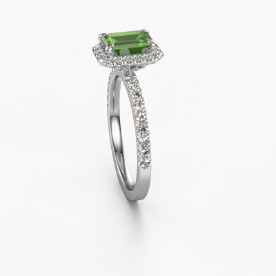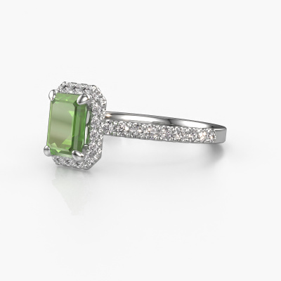 Der oben gezeigte Verlobungsring wird Miranda eme genannt. Es ist ein Halo Ring, da er einen zentralen Edelstein und ein Band mit Pavé-Fassung hat. Der Platin ring ist mit einem 7x5 mm smaragd schliff Turmalin grün-Mittelstein besetzt und um ihn herum eine Pavé-Fassung mit Diamanten. Was diesen klassische, Platin Halo Ring besonders macht, sind die kleineren Steine, die den zentralen Stein umschließen. Dieser wunderschöne Verlobungsring wird als Halo Ring bezeichnet, da die kleineren Edelsteine dem zentralen Stein einen Lichthof geben. Damit die kleineren Steine den Mittelstein verstärken, müssen sie so platziert werden, dass keine Lichteinflüsse auftreten. Und hier kommen unsere erfahrenen Goldschmiede ins Spiel. Jeder einzelne Stein wird sorgfältig von Hand in den Ring gesetzt. Während der Herstellung wird der Lichteinfall ständig überprüft. So können wir sicherstellen, dass der spezielle Lichtkranz noch sichtbar ist. Am Ende erhalten Sie einen einzigartigen Verlobungsring mit einem grüner Turmalin Ihrer Wahl in der Mitte. Sie können sich die Wirkung eines solchen Ringes vorstellen, wenn Sie ihn an ihrem besonderen Tag für sie zum Leuchten bringen. Durch die Kombination modernster Technik mit uralter Handwerkskunst können wir alle Verlobungsringe in unserem eigenen Studio anfertigen. Jedes Schmuckstück wird auf Anfrage gefertigt. Das ist vorteilhaft, weil wir Ihnen dadurch einen Preis anbieten können, den Sie nirgendwo anders finden.Unsere Designer und Goldschmiede arbeiten jeden Tag zusammen und versuchen, neue Schmuckstücke zu kreieren. Vielleicht haben Sie irgendwo einen schönen, klassische Verlobungsring gefunden, nach dem Ihr einzigartiger Ring gestaltet werden kann. Setzen Sie sich mit uns in Verbindung. Wir machen Ihnen ein Angebot, basierend auf einem fairen Preis/Leistungsverhältnis, das Sie begeistern wird.Um es einfacher zu machen, bieten wir eine kostenlose 30-tägige Rücksendung.