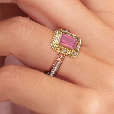 Dieser Verlobungsring aus 14 Karat Roségold heißt Alice EME und hat einen 7x5 mm Turmalin rosa. Ein außergewöhnlicher, Roségold Vintage Ring. Einer, der die Liebe Ihres Lebens mit Sicherheit wie ein Turmalin rosa erstrahlen lässt! Das hoffen wir zu erreichen. Dieser Vintage Verlobungsring ist mit exquisiten Turmalin rosa besetzt. Welchen Edelstein Sie aus unserer Auswahl haben möchten, liegt ganz bei Ihnen. Der Edelstein wird mit großer Sorgfalt ausgewählt. Denn wir glauben, dass Ihr Perle Ränder Verlobungsring nur mit dem schönsten Edelstein gekrönt sein darf. Sehen Sie das auch so? Unser erfahrener Juwelier entwirft Ihren Ring in unserem eigenen Studio, wo der Turmalin rosa mit großer Präzision eingefasst wird. Der Ring wird dann bearbeitet und poliert, bis er perfekt ist. Nichts als das Beste für die Liebe Ihres Lebens! Jedes Schmuckstück wird von unseren Meister-Goldschmieden in unserem eigenen Studio für Sie gefertigt.Durch die Kombination modernster Technik mit uralter Handwerkskunst können wir alle Verlobungsringe in unserem eigenen Studio anfertigen. Jedes Schmuckstück wird auf Anfrage gefertigt. Das ist vorteilhaft, weil wir Ihnen dadurch einen Preis anbieten können, den Sie nirgendwo anders finden.Haben Sie einen bestimmten Ring im Sinn? Eines, dass Sie irgendwo gesehen haben. Bitte zögern Sie nicht, uns zu sagen, was Sie wollen und wir werden Ihr Design in einen Einzigartigen Verlobungsring verwandeln. Sie können die Entwicklungen Ihres Ringdesigns verfolgen, da wir 3D-Zeichnungen verwenden. Das gibt Ihnen eine realistische Vorschau Ihres Designs. Wir senden Ihnen gerne ein unverbindliches Angebot zu einem fairen Preis/Leistungsverhältnis. Es wird Sie erstaunen.Um es einfacher zu machen, bieten wir eine kostenlose 30-tägige Rücksendung.