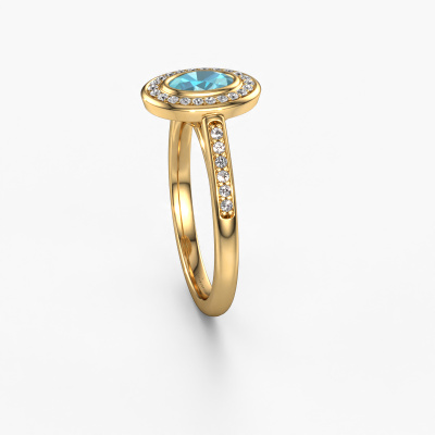 Der oben gezeigte Verlobungsring wird Noud 2 OVL genannt. Es ist ein Halo Ring, da er einen zentralen Edelstein und ein Band mit Pavé-Fassung hat. Der 14 Karat Gold ring ist mit einem 6x4 mm oval Blau Topas-Mittelstein besetzt und um ihn herum eine Pavé-Fassung mit Lab grown Diamant. Was diesen exklusive, Gold Halo Ring besonders macht, sind die kleineren Steine, die den zentralen Stein umschließen. Dieser wunderschöne Verlobungsring wird als Halo Ring bezeichnet, da die kleineren Edelsteine dem zentralen Stein einen Lichthof geben. Damit die kleineren Steine den Mittelstein verstärken, müssen sie so platziert werden, dass keine Lichteinflüsse auftreten. Und hier kommen unsere erfahrenen Goldschmiede ins Spiel. Jeder einzelne Stein wird sorgfältig von Hand in den Ring gesetzt. Während der Herstellung wird der Lichteinfall ständig überprüft. So können wir sicherstellen, dass der spezielle Lichtkranz noch sichtbar ist. Am Ende erhalten Sie einen einzigartigen Verlobungsring mit einem Blaue Topas Ihrer Wahl in der Mitte. Sie können sich die Wirkung eines solchen Ringes vorstellen, wenn Sie ihn an ihrem besonderen Tag für sie zum Leuchten bringen. Mit unserer modernen Technik können wir Schmuckstücke von höchster Qualität mit größter Sorgfalt für Sie entwerfen und anpassen. Unsere Verlobungsringe sind immer um 30 Prozent günstiger als bei anderen Juwelieren. Wir fertigen Verlobungsringe auf Bestellung, also müssen wir keine großen Lager unterhalten. Wenn Sie ein bestimmtes Budget haben, beraten wir Sie gerne entsprechend.Haben Sie irgendwo einen bestimmten Verlobungsring gefunden, den Sie Ihrem Liebsten schenken möchten? Sie können uns gerne sagen, was Sie wollen und wir werden Ihr Design in einen Einzigartigen exklusive Verlobungsring verwandeln. Sie können die Entwicklungen Ihres Ringdesigns verfolgen, da wir 3D-Zeichnungen verwenden. Das gibt Ihnen eine realistische Vorschau, wie Ihr Design aussehen wird. Sie können auch einen Dummy vorbestellen. Ein Dummy ist ein Kunststoffring, der nach Ihrem Ringdesign gestaltet werden kann. Sie können ihn anprobieren und prüfen, ob seine Breite und Größe für Sie geeignet sind. Wir senden Ihnen gerne ein unverbindliches Angebot zu einem fairen Preis/Leistungsverhältnis. Sie werden in Anbetracht der Qualität des Rings und der Edelsteine überrascht sein.Um es einfacher zu machen, bieten wir eine kostenlose 30-tägige Rücksendung.