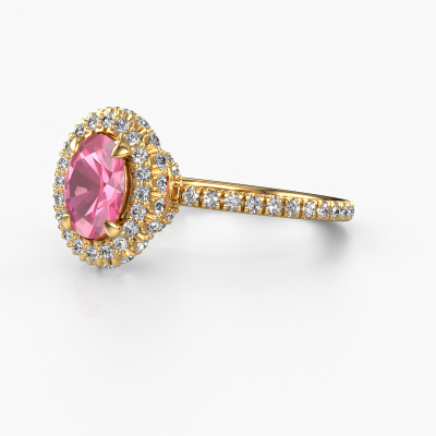 Der oben gezeigte Verlobungsring wird Talitha OVL genannt. Es ist ein Halo Ring, da er einen zentralen Edelstein und ein Band mit Pavé-Fassung hat. Der 14 Karat Gold ring ist mit einem 7x5 mm oval Pink Saphir-Mittelstein besetzt und um ihn herum eine Pavé-Fassung mit Lab grown Diamant. Was diesen klassische, Gold Halo Ring besonders macht, sind die kleineren Steine, die den zentralen Stein umschließen. Dieser wunderschöne Verlobungsring wird als Halo Ring bezeichnet, da die kleineren Edelsteine dem zentralen Stein einen Lichthof geben. Damit die kleineren Steine den Mittelstein verstärken, müssen sie so platziert werden, dass keine Lichteinflüsse auftreten. Und hier kommen unsere erfahrenen Goldschmiede ins Spiel. Jeder einzelne Stein wird sorgfältig von Hand in den Ring gesetzt. Während der Herstellung wird der Lichteinfall ständig überprüft. So können wir sicherstellen, dass der spezielle Lichtkranz noch sichtbar ist. Am Ende erhalten Sie einen einzigartigen Verlobungsring mit einem Pink Saphir Ihrer Wahl in der Mitte. Sie können sich die Wirkung eines solchen Ringes vorstellen, wenn Sie ihn an ihrem besonderen Tag für sie zum Leuchten bringen. Durch die Kombination modernster Technik mit uralter Handwerkskunst können wir alle Verlobungsringe in unserem eigenen Studio anfertigen. Jedes Schmuckstück wird auf Anfrage gefertigt. Das ist vorteilhaft, weil wir Ihnen dadurch einen Preis anbieten können, den Sie nirgendwo anders finden.Unsere Designer und Goldschmiede arbeiten jeden Tag zusammen und versuchen, neue Schmuckstücke zu kreieren. Vielleicht haben Sie irgendwo einen schönen, klassische Verlobungsring gefunden, nach dem Ihr einzigartiger Ring gestaltet werden kann. Setzen Sie sich mit uns in Verbindung. Wir machen Ihnen ein Angebot, basierend auf einem fairen Preis/Leistungsverhältnis, das Sie begeistern wird.Um es einfacher zu machen, bieten wir eine kostenlose 30-tägige Rücksendung.