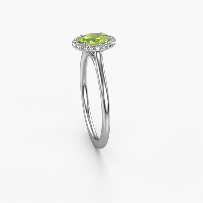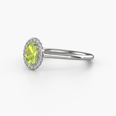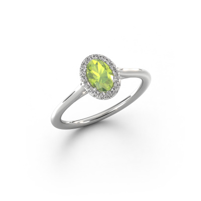 Der oben gezeigte Verlobungsring wird Seline ovl 1 genannt. Es ist ein Halo Ring, da er einen zentralen Edelstein und ein Band mit Pavé-Fassung hat. Der 14 Karat Weißgold ring ist mit einem 6x4 mm oval Peridot-Mittelstein besetzt und um ihn herum eine Pavé-Fassung mit Diamanten. Was diesen klassische, Weißgold Halo Ring besonders macht, sind die kleineren Steine, die den zentralen Stein umschließen. Dieser wunderschöne Verlobungsring wird als Halo Ring bezeichnet, da die kleineren Edelsteine dem zentralen Stein einen Lichthof geben. Damit die kleineren Steine den Mittelstein verstärken, müssen sie so platziert werden, dass keine Lichteinflüsse auftreten. Und hier kommen unsere erfahrenen Goldschmiede ins Spiel. Jeder einzelne Stein wird sorgfältig von Hand in den Ring gesetzt. Während der Herstellung wird der Lichteinfall ständig überprüft. So können wir sicherstellen, dass der spezielle Lichtkranz noch sichtbar ist. Am Ende erhalten Sie einen einzigartigen Verlobungsring mit einem Peridot Ihrer Wahl in der Mitte. Sie können sich die Wirkung eines solchen Ringes vorstellen, wenn Sie ihn an ihrem besonderen Tag für sie zum Leuchten bringen. Haben Sie ein bestimmtes Budget? Sie können uns gerne kontaktieren, damit wir Ihre Optionen besprechen können. Wir bieten unsere Verlobungsringe zum garantiert besten Preis, denn wir fertigen sie auf Bestellung. Solche Preise finden Sie nirgendwo anders!Unser Team fügt unserer Online-Kollektion täglich neue Designs hinzu. Unsere Designer und Goldschmiede arbeiten zusammen, um das beste Design zu kreieren. Wir bemühen uns, eine vielfältige Kollektion von Schmuckstücken anzubieten. Vielleicht haben Sie ein bestimmtes Design im Sinn. Eines, dass Sie irgendwo gesehen haben. Gerne geben wir Ihnen eine kostenlose Beratung. Wir machen Ihnen ein Angebot, basierend auf einem fairen Preis/Leistungsverhältnis, das Sie verblüffen wird.Um es einfacher zu machen, bieten wir eine kostenlose 30-tägige Rücksendung.