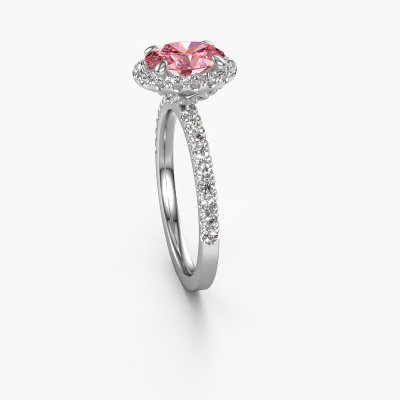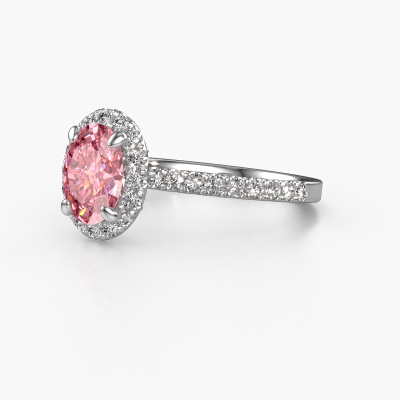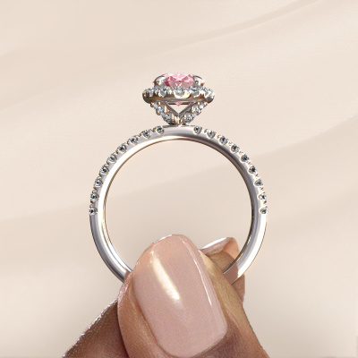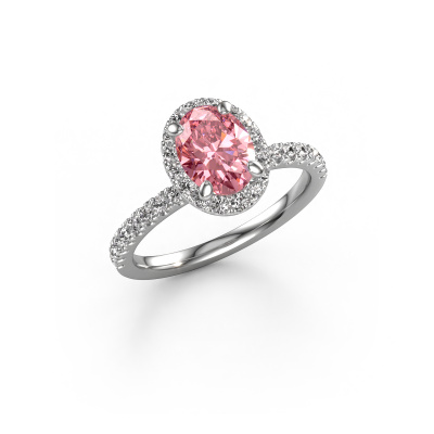 Der oben gezeigte Verlobungsring wird Miranda ovl genannt. Es ist ein Halo Ring, da er einen zentralen Edelstein und ein Band mit Pavé-Fassung hat. Der 14 Karat Weißgold ring ist mit einem 8x6 mm oval rosa Labordiamant-Mittelstein besetzt und um ihn herum eine Pavé-Fassung mit Lab grown Diamant. Was diesen exklusive, Weißgold Halo Ring besonders macht, sind die kleineren Steine, die den zentralen Stein umschließen. Dieser wunderschöne Verlobungsring wird als Halo Ring bezeichnet, da die kleineren Edelsteine dem zentralen Stein einen Lichthof geben. Damit die kleineren Steine den Mittelstein verstärken, müssen sie so platziert werden, dass keine Lichteinflüsse auftreten. Und hier kommen unsere erfahrenen Goldschmiede ins Spiel. Jeder einzelne Stein wird sorgfältig von Hand in den Ring gesetzt. Während der Herstellung wird der Lichteinfall ständig überprüft. So können wir sicherstellen, dass der spezielle Lichtkranz noch sichtbar ist. Am Ende erhalten Sie einen einzigartigen Verlobungsring mit einem rosa Labordiamanten Ihrer Wahl in der Mitte. Sie können sich die Wirkung eines solchen Ringes vorstellen, wenn Sie ihn an ihrem besonderen Tag für sie zum Leuchten bringen. Durch die Kombination modernster Technik mit uralter Handwerkskunst können wir alle Verlobungsringe in unserem eigenen Studio anfertigen. Jedes Schmuckstück wird auf Anfrage gefertigt. Das ist vorteilhaft, weil wir Ihnen dadurch einen Preis anbieten können, den Sie nirgendwo anders finden.Unsere Designer und Goldschmiede arbeiten jeden Tag zusammen und versuchen, neue Schmuckstücke zu kreieren. Vielleicht haben Sie irgendwo einen schönen, exklusive Verlobungsring gefunden, nach dem Ihr einzigartiger Ring gestaltet werden kann. Setzen Sie sich mit uns in Verbindung. Wir machen Ihnen ein Angebot, basierend auf einem fairen Preis/Leistungsverhältnis, das Sie begeistern wird.Um es einfacher zu machen, bieten wir eine kostenlose 30-tägige Rücksendung.