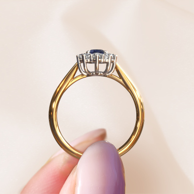 Der oben gezeigte Ring, mit dem Namen Leesa 1, nennen wir einen Lady Diana Verlobungsring. Der Cluster Ring trägt einem zentralen Edelstein, umgeben von kleineren Steinen. Diese Version in 14 Karat Gold hat einen oval Saphir von oval als Mittelstein, umschlossen von kleineren Diamanten. Was diesen klassische Gold Lady Diana Ring besonders macht, sind die kleinen Edelsteine rund um den zentralen Saphir, die wie eine schöne Blume geformt sind. Der umgebende Steinkranz umrahmt den Mittelstein so, dass er größer erscheint. Diese Art von Verlobungsring wird auch Blumen- oder Rosettenring genannt. Es ist sehr wichtig, dass die kleineren Saphir identisch positioniert sind, so dass es kein Spiel im Licht, sondern eine perfekte Einheit ergibt. Unsere erfahrenen Juweliere erledigen diese Arbeit. Jeder einzelne Stein wird sorgfältig von Hand gesetzt. Während der Herstellung wird der Lichteinfall ständig überwacht, um sicherzustellen, dass der spezielle Lady Diana-Effekt noch sichtbar ist. Am Ende bekommen Sie den perfekten Verlobungsring mit einem strahlenden Saphir Edelstein Herzstück. Sie können sich die Wirkung eines solchen Ringes vorstellen, wenn Sie ihn an ihrem besonderen Tag für die Liebe Ihres Lebens zum Leuchten bringen. Jedes Schmuckstück lässt Ihren Finger erstrahlen. Ihr Ring ist mit Liebe von unseren Goldschmieden handgefertigt.Nachdem Sie Ihre Bestellung aufgegeben haben, beginnen unsere Goldschmiede mit dem kreativen Prozess der Herstellung Ihres Leesa 1 Verlobungsring. Wir haben keine Lager. Das ist vorteilhaft, da diese Kosten nicht an Sie weitergegeben werden. Daher sind wir in der Lage, Schmuck zu außergewöhnlich niedrigen Preisen anzubieten.Haben Sie irgendwo einen bestimmten Verlobungsring gefunden, den Sie Ihrem Liebsten schenken möchten? Sie können uns gerne sagen, was Sie wollen und wir werden Ihr Design in einen Einzigartigen klassische Verlobungsring verwandeln. Sie können die Entwicklungen Ihres Ringdesigns verfolgen, da wir 3D-Zeichnungen verwenden. Das gibt Ihnen eine realistische Vorschau, wie Ihr Design aussehen wird. Sie können auch einen Dummy vorbestellen. Ein Dummy ist ein Kunststoffring, der nach Ihrem Ringdesign gestaltet werden kann. Sie können ihn anprobieren und prüfen, ob seine Breite und Größe für Sie geeignet sind. Wir senden Ihnen gerne ein unverbindliches Angebot zu einem fairen Preis/Leistungsverhältnis. Sie werden in Anbetracht der Qualität des Rings und der Edelsteine überrascht sein.Um es einfacher zu machen, bieten wir eine kostenlose 30-tägige Rücksendung.