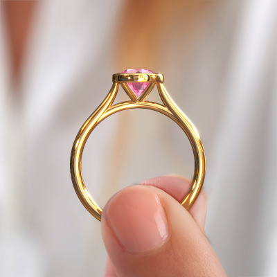 Der oben gezeigte Verlobungsring wird Lavon RND genannt. Wir nennen das einen Solitär-Ring, denn er hat einen einzelnen Edelstein. Es ist ein 14 Karat Gold Verlobungsring, mit 6.5 mm rund Pink Saphir. Dieser außergewöhnliche, moderne Gold Solitär-Verlobungsring mit einem schönen, rund Pink Saphir soll Ihrem Antrag ein Funkeln geben. Die offenen Krappen ermöglichen, dass Licht aus mehr Winkeln auf den Edelstein trifft. Wussten Sie, dass ein Pink Saphir für ewige Liebe und Treue steht? Das macht ihn zum perfekten Mittelstück. Unsere Goldschmiede positioniert den Edelstein Ihrer Wahl sorgfältig oben auf dem Ring. Dadurch sticht er hervor. Jedes Schmuckstück wird hergestellt von einem Team leidenschaftlicher Goldschmiede und Schmuckdesigner. Das wird Ihr Kronjuwel unbedingt zu einem Blickfang machen.Haben Sie ein bestimmtes Budget? Sie können uns gerne kontaktieren, damit wir Ihre Optionen besprechen können. Wir bieten unsere Verlobungsringe zum garantiert besten Preis, denn wir fertigen sie auf Bestellung. Solche Preise finden Sie nirgendwo anders!Unser Team fügt unserer Online-Kollektion täglich neue Designs hinzu. Unsere Designer und Goldschmiede arbeiten zusammen, um das beste Design zu kreieren. Wir bemühen uns, eine vielfältige Kollektion von Schmuckstücken anzubieten. Vielleicht haben Sie ein bestimmtes Design im Sinn. Eines, dass Sie irgendwo gesehen haben. Gerne geben wir Ihnen eine kostenlose Beratung. Wir machen Ihnen ein Angebot, basierend auf einem fairen Preis/Leistungsverhältnis, das Sie verblüffen wird.Um es einfacher zu machen, bieten wir eine kostenlose 30-tägige Rücksendung.