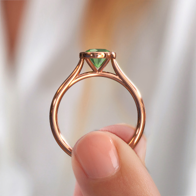 Der oben gezeigte Verlobungsring wird Lavon RND genannt. Wir nennen das einen Solitär-Ring, denn er hat einen einzelnen Edelstein. Es ist ein 14 Karat Roségold Verlobungsring, mit 6.5 mm rund Turmalin grün. Dieser außergewöhnliche, moderne Roségold Solitär-Verlobungsring mit einem schönen, rund Turmalin grün soll Ihrem Antrag ein Funkeln geben. Die offenen Krappen ermöglichen, dass Licht aus mehr Winkeln auf den Edelstein trifft. Wussten Sie, dass ein Turmalin grün für ewige Liebe und Treue steht? Das macht ihn zum perfekten Mittelstück. Unsere Goldschmiede positioniert den Edelstein Ihrer Wahl sorgfältig oben auf dem Ring. Dadurch sticht er hervor. Jedes Schmuckstück wird hergestellt von einem Team leidenschaftlicher Goldschmiede und Schmuckdesigner. Das wird Ihr Kronjuwel unbedingt zu einem Blickfang machen.Haben Sie ein bestimmtes Budget? Sie können uns gerne kontaktieren, damit wir Ihre Optionen besprechen können. Wir bieten unsere Verlobungsringe zum garantiert besten Preis, denn wir fertigen sie auf Bestellung. Solche Preise finden Sie nirgendwo anders!Unser Team fügt unserer Online-Kollektion täglich neue Designs hinzu. Unsere Designer und Goldschmiede arbeiten zusammen, um das beste Design zu kreieren. Wir bemühen uns, eine vielfältige Kollektion von Schmuckstücken anzubieten. Vielleicht haben Sie ein bestimmtes Design im Sinn. Eines, dass Sie irgendwo gesehen haben. Gerne geben wir Ihnen eine kostenlose Beratung. Wir machen Ihnen ein Angebot, basierend auf einem fairen Preis/Leistungsverhältnis, das Sie verblüffen wird.Um es einfacher zu machen, bieten wir eine kostenlose 30-tägige Rücksendung.