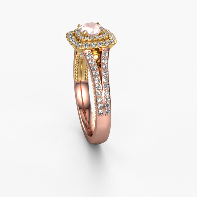 Der oben gezeigte Roségold Verlobungsring wird Annette genannt. Es ist ein Halo Ring, da er einen zentralen Edelstein und ein Band mit Pavé-Fassung hat. Der Vintage Halo Verlobungsring ist in der Kombination 14 Karat Roségold mit Gold und ist mit einem rund 5 mm Morganit Champagner-Mittelstein besetzt und das Band hat eine Pavé-Fassung mit Diamanten. Jedes Schmuckstück wird von unseren Meister-Goldschmieden in unserem eigenen Studio für Sie gefertigt. Um den zentralen Stein noch mehr zu betonen, hat das Band eine Pavé-Fassung mit weiteren Morganit Champagner. Durch die offenen Krappen kann das Licht aus mehreren Winkeln auf den Morganit Champagner treffen und der Morganit Champagner-Ring funkelt noch mehr. Das obere Foto zeigt die leidenschaftlich handgefertigten Details des Rings. Die hohe Positionierung der Mittelstein ist ein echter Blickfang. Der perfekte Verlobungsring für das Kronjuwel Ihres Lebens!Nach Erhalt Ihrer Bestellung beginnen unsere Goldschmiede mit Leidenschaft den kreativen Prozess und fertigen Ihren Verlobungsring in unserem eigenen Studio. Da wir keine großen Lager haben, werden diese Kosten nicht an Sie weitergegeben. Unsere Preisgestaltung ist der Beweis dafür! Wir bieten Schmuck zum niedrigsten Preis, garantiert.Haben Sie irgendwo einen bestimmten Verlobungsring gefunden, den Sie Ihrem Liebsten schenken möchten? Sie können uns gerne sagen, was Sie wollen und wir werden Ihr Design in einen Einzigartigen Vintage Verlobungsring verwandeln. Sie können die Entwicklungen Ihres Ringdesigns verfolgen, da wir 3D-Zeichnungen verwenden. Das gibt Ihnen eine realistische Vorschau, wie Ihr Design aussehen wird. Sie können auch einen Dummy vorbestellen. Ein Dummy ist ein Kunststoffring, der nach Ihrem Ringdesign gestaltet werden kann. Sie können ihn anprobieren und prüfen, ob seine Breite und Größe für Sie geeignet sind. Wir senden Ihnen gerne ein unverbindliches Angebot zu einem fairen Preis/Leistungsverhältnis. Sie werden in Anbetracht der Qualität des Rings und der Edelsteine überrascht sein.Um es einfacher zu machen, bieten wir eine kostenlose 30-tägige Rücksendung.