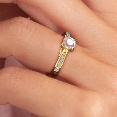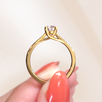 Der oben gezeigte Ring wird Mia 2 genannt. Es ist ein Pavé Solitär Ring, da er einen zentralen Edelstein und ein Band mit Pavé-Fassung hat. Dieser 14 Karat Gold ring ist mit einem 5 mm rund Morganit Champagner-Mittelstein besetzt und das Band hat eine Pavé-Fassung mit Lab grown Diamant. Jedes Schmuckstück wird nur für Sie persönlich hergestellt, mit Liebe zum Detail und Design.Dieser moderne Gold Pavé Solitär Verlobungsring mit Pavé-Fassung hat einen exquisiten, rund Morganit Champagner als Mittelstein. Um den zentralen Stein noch mehr zu betonen, hat das Band eine Pavé-Fassung mit weiteren Lab grown Diamant. Durch die offenen Krappen kann das Licht aus mehreren Winkeln auf den Morganit Champagner treffen und der Morganit Champagner-Ring funkelt noch mehr. Das obere Foto zeigt die leidenschaftlich handgefertigten Details des Rings. Die hohe Positionierung der Mittelstein ist ein echter Blickfang. Der perfekte Verlobungsring für das Kronjuwel Ihres Lebens!Mit unserer modernen Technik können wir Schmuckstücke von höchster Qualität mit größter Sorgfalt für Sie entwerfen und anpassen. Unsere Verlobungsringe sind immer um 30 Prozent günstiger als bei anderen Juwelieren. Wir fertigen Verlobungsringe auf Bestellung, also müssen wir keine großen Lager unterhalten. Wenn Sie ein bestimmtes Budget haben, beraten wir Sie gerne entsprechend.Verschiedene Arten von neuen Ringen werden täglich von unserem Team angefertigt. Vielleicht haben Sie irgendwo einen Pavé Solitär Verlobungsring gefunden. Einen, den Sie Ihrem Liebsten schenken möchten. Bitte zögern Sie nicht, unseren Schmuckdesignern Ihre Gedanken und Ihr Design zu zeigen. Wir würden gerne Ihr Design in einen moderne Verlobungsring verwandeln. Sie können die Entwicklungen Ihres Ringdesigns verfolgen, da wir sehr detaillierte 3D-Zeichnungen verwenden. Darüber hinaus können Sie einen Dummy des Designs bestellen. Ein Dummy ist ein Kunststoffring, der nach Ihrem Ringdesign gestaltet werden kann. Sie können ihn anprobieren und prüfen, ob der Verlobungsring Ihren Vorstellungen entspricht. Wir senden Ihnen gerne ein unverbindliches Angebot zu einem fairen Preis/Leistungsverhältnis. Das Angebot wird Sie angesichts der Qualität des Rings und der Edelsteine verblüffen.Um es einfacher zu machen, bieten wir eine kostenlose 30-tägige Rücksendung.