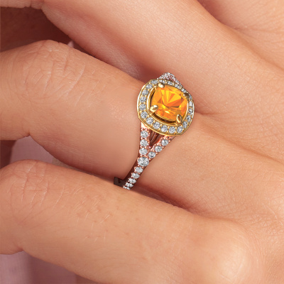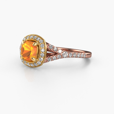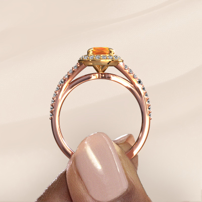 Der oben gezeigte Verlobungsring wird Pamela CUS genannt. Es ist ein Halo Ring, da er einen zentralen Edelstein und ein Band mit Pavé-Fassung hat. Der 14 Karat Roségold ring ist mit einem 5.5 mm cussion Citrin-Mittelstein besetzt und um ihn herum eine Pavé-Fassung mit Lab grown Diamant. Was diesen Luxus, Roségold Pavé Solitär Ring besonders macht, sind die kleineren Steine, die den zentralen Stein umschließen. Dieser wunderschöne Verlobungsring wird als Pavé Solitär Ring bezeichnet, da die kleineren Edelsteine dem zentralen Stein einen Lichthof geben. Damit die kleineren Steine den Mittelstein verstärken, müssen sie so platziert werden, dass keine Lichteinflüsse auftreten. Und hier kommen unsere erfahrenen Goldschmiede ins Spiel. Jeder einzelne Stein wird sorgfältig von Hand in den Ring gesetzt. Während der Herstellung wird der Lichteinfall ständig überprüft. So können wir sicherstellen, dass der spezielle Lichtkranz noch sichtbar ist. Am Ende erhalten Sie einen einzigartigen Verlobungsring mit einem Citrin Ihrer Wahl in der Mitte. Sie können sich die Wirkung eines solchen Ringes vorstellen, wenn Sie ihn an ihrem besonderen Tag für sie zum Leuchten bringen. Nach Erhalt Ihrer Bestellung beginnen unsere Goldschmiede mit Leidenschaft den kreativen Prozess und fertigen Ihren Verlobungsring in unserem eigenen Studio. Da wir keine großen Lager haben, werden diese Kosten nicht an Sie weitergegeben. Unsere Preisgestaltung ist der Beweis dafür! Wir bieten Schmuck zum niedrigsten Preis, garantiert.Verschiedene Arten von neuen Ringen werden täglich von unserem Team angefertigt. Vielleicht haben Sie irgendwo einen Pavé Solitär Verlobungsring gefunden. Einen, den Sie Ihrem Liebsten schenken möchten. Bitte zögern Sie nicht, unseren Schmuckdesignern Ihre Gedanken und Ihr Design zu zeigen. Wir würden gerne Ihr Design in einen Luxus Verlobungsring verwandeln. Sie können die Entwicklungen Ihres Ringdesigns verfolgen, da wir sehr detaillierte 3D-Zeichnungen verwenden. Darüber hinaus können Sie einen Dummy des Designs bestellen. Ein Dummy ist ein Kunststoffring, der nach Ihrem Ringdesign gestaltet werden kann. Sie können ihn anprobieren und prüfen, ob der Verlobungsring Ihren Vorstellungen entspricht. Wir senden Ihnen gerne ein unverbindliches Angebot zu einem fairen Preis/Leistungsverhältnis. Das Angebot wird Sie angesichts der Qualität des Rings und der Edelsteine verblüffen.Um es einfacher zu machen, bieten wir eine kostenlose 30-tägige Rücksendung.