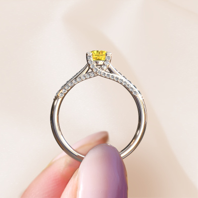 Dieser Ring aus Platin heißt Mia 3 und hat 5 mm Gelb Saphir. Dieser blinkende Platin Pavé Solitär Verlobungsring ist ein wahres Kunstwerk! Die Ornamente werden mit viel Geduld und großer Leidenschaft gefertigt. Um diesen Ring mit großer Präzision zu schaffen, erfordert dieses Handwerk ein scharfes Auge und eine geschickte Hand. Eine Herausforderung, die bei unseren erfahrenen Juwelieren ein Feuer entfacht. Die exquisiten Gelb Saphir sind auf eine besondere Art und Weise gefasst, so dass sie noch mehr hervorstechen. Dies verleiht dem Ring eine noch glamourösere Erscheinung. Der Ring an sich ist schon wegen der Edelsteine einzigartig, die wir speziell für diesen Ring auswählen. Obendrein wählen Sie die Edelmetalle aus, mit denen Ihr einzigartiger Ring für die außergewöhnlichste Frau Ihres Lebens gemacht wird! Jedes Schmuckstück ist einzigartig in jeder Hinsicht! Einfach nach Ihren Wünschen anzupassen.Haben Sie ein bestimmtes Budget? Sie können uns gerne kontaktieren, damit wir Ihre Optionen besprechen können. Wir bieten unsere Verlobungsringe zum garantiert besten Preis, denn wir fertigen sie auf Bestellung. Solche Preise finden Sie nirgendwo anders!Unser Team fügt unserer Online-Kollektion täglich neue Designs hinzu. Unsere Designer und Goldschmiede arbeiten zusammen, um das beste Design zu kreieren. Wir bemühen uns, eine vielfältige Kollektion von Schmuckstücken anzubieten. Vielleicht haben Sie ein bestimmtes Design im Sinn. Eines, dass Sie irgendwo gesehen haben. Gerne geben wir Ihnen eine kostenlose Beratung. Wir machen Ihnen ein Angebot, basierend auf einem fairen Preis/Leistungsverhältnis, das Sie verblüffen wird.Um es einfacher zu machen, bieten wir eine kostenlose 30-tägige Rücksendung.