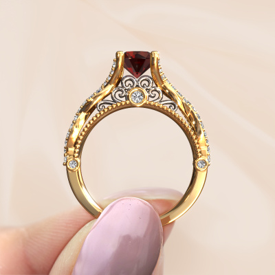 Dieser gewagte Verlobungsring aus 14 Karat Gold heißt Chantelle und hat 6.5 mm Granat. Ist Ihre Freundin von Vintage begeistert? Dann wird dieser Gold Verlobungsring sicherlich perfekt zu ihrem Stil passen. Ein trendiger Ring mit einem Hauch von klassischem Schmuck. Ein wirklich atemberaubendes, romantisches Design! Vor allem, wenn Sie den Ring nach ihren Wünschen anpassen. Dieser Vintage Pavé Solitär Verlobungsring ist mit atemberaubenden Granat besetzt. Wie Sie sehen können, sind Sie der Boss bei der Auswahl des Edelsteins, der am besten zu Ihrer Freundin passt. Jeder Edelstein wird sorgfältig von unseren Händlern ausgewählt, die auf der ganzen Welt verteilt sind. Nichts als die besten Edelsteine für unseren erfahrenen Juwelier! Schließlich ist es seine Krönung! Jedes Schmuckstück wird hergestellt von einem Team leidenschaftlicher Goldschmiede und Schmuckdesigner. Das wird Ihr Kronjuwel unbedingt zu einem Blickfang machen.Haben Sie ein bestimmtes Budget? Sie können uns gerne kontaktieren, damit wir Ihre Optionen besprechen können. Wir bieten unsere Verlobungsringe zum garantiert besten Preis, denn wir fertigen sie auf Bestellung. Solche Preise finden Sie nirgendwo anders!Unsere Designer und Goldschmiede arbeiten jeden Tag zusammen und versuchen, neue Schmuckstücke zu kreieren. Vielleicht haben Sie irgendwo einen schönen, Vintage Verlobungsring gefunden, nach dem Ihr einzigartiger Ring gestaltet werden kann. Setzen Sie sich mit uns in Verbindung. Wir machen Ihnen ein Angebot, basierend auf einem fairen Preis/Leistungsverhältnis, das Sie begeistern wird.Um es einfacher zu machen, bieten wir eine kostenlose 30-tägige Rücksendung.