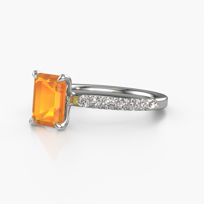 Der oben gezeigte Verlobungsring wird Crystal EME 2 genannt. Wir nennen das einen Solitär-Ring, denn er hat einen einzelnen Edelstein. Es ist ein Platin Verlobungsring, mit 8x6 mm smaragd schliff Citrin. Dieser exklusive Platin Solitär-Ring mit exquisitem, smaragd schliff Citrin ist ein schöner Verlobungsring. Die offenen Krappen ermöglichen, dass Licht aus mehr Winkeln auf den Edelstein trifft. Der Ring besticht auch durch die hohe Positionierung des Edelsteins. Denn Citrin symbolisieren wahre Liebe und Reinheit und machen sie damit zum perfekten Geschenk für die Liebe Ihres Lebens. Das Symbol der ewigen Liebe ist das Herzstück dieses Solitär-Rings. Wie ein Citrin haben auch alle anderen Arten von Edelmetallen ihre eigenen, zugeschriebenen symbolischen Bedeutungen. Diese Pavé Solitär Verlobungsring können Sie selbst zusammenstellen in verschiedenen Edelmetall Kombinationen. Dieser hat die Kombination Platin mit Platin. Jedes Schmuckstück wird von unseren Meister-Goldschmieden in unserem eigenen Studio für Sie gefertigt.Durch die Kombination modernster Technik mit uralter Handwerkskunst können wir alle Verlobungsringe in unserem eigenen Studio anfertigen. Jedes Schmuckstück wird auf Anfrage gefertigt. Das ist vorteilhaft, weil wir Ihnen dadurch einen Preis anbieten können, den Sie nirgendwo anders finden.Unser Team fügt unserer Online-Kollektion täglich neue Designs hinzu. Unsere Designer und Goldschmiede arbeiten zusammen, um das beste Design zu kreieren. Wir bemühen uns, eine vielfältige Kollektion von Schmuckstücken anzubieten. Vielleicht haben Sie ein bestimmtes Design im Sinn. Eines, dass Sie irgendwo gesehen haben. Gerne geben wir Ihnen eine kostenlose Beratung. Wir machen Ihnen ein Angebot, basierend auf einem fairen Preis/Leistungsverhältnis, das Sie verblüffen wird.Um es einfacher zu machen, bieten wir eine kostenlose 30-tägige Rücksendung.