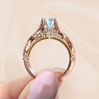 Dieser gewagte Verlobungsring aus 14 Karat Roségold heißt Chantelle und hat 6.5 mm Aquamarin. Ist Ihre Freundin von Vintage begeistert? Dann wird dieser Roségold Verlobungsring sicherlich perfekt zu ihrem Stil passen. Ein trendiger Ring mit einem Hauch von klassischem Schmuck. Ein wirklich atemberaubendes, romantisches Design! Vor allem, wenn Sie den Ring nach ihren Wünschen anpassen. Dieser Vintage Pavé Solitär Verlobungsring ist mit atemberaubenden Aquamarins besetzt. Wie Sie sehen können, sind Sie der Boss bei der Auswahl des Edelsteins, der am besten zu Ihrer Freundin passt. Jeder Edelstein wird sorgfältig von unseren Händlern ausgewählt, die auf der ganzen Welt verteilt sind. Nichts als die besten Edelsteine für unseren erfahrenen Juwelier! Schließlich ist es seine Krönung! Jedes Schmuckstück wird hergestellt von einem Team leidenschaftlicher Goldschmiede und Schmuckdesigner. Das wird Ihr Kronjuwel unbedingt zu einem Blickfang machen.Haben Sie ein bestimmtes Budget? Sie können uns gerne kontaktieren, damit wir Ihre Optionen besprechen können. Wir bieten unsere Verlobungsringe zum garantiert besten Preis, denn wir fertigen sie auf Bestellung. Solche Preise finden Sie nirgendwo anders!Unsere Designer und Goldschmiede arbeiten jeden Tag zusammen und versuchen, neue Schmuckstücke zu kreieren. Vielleicht haben Sie irgendwo einen schönen, Vintage Verlobungsring gefunden, nach dem Ihr einzigartiger Ring gestaltet werden kann. Setzen Sie sich mit uns in Verbindung. Wir machen Ihnen ein Angebot, basierend auf einem fairen Preis/Leistungsverhältnis, das Sie begeistern wird.Um es einfacher zu machen, bieten wir eine kostenlose 30-tägige Rücksendung.