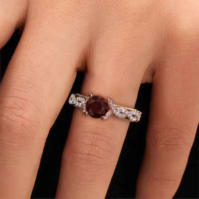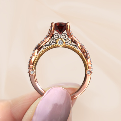 Dieser gewagte Verlobungsring aus 14 Karat Roségold heißt Chantelle und hat 6.5 mm Granat. Ist Ihre Freundin von Vintage begeistert? Dann wird dieser Roségold Verlobungsring sicherlich perfekt zu ihrem Stil passen. Ein trendiger Ring mit einem Hauch von klassischem Schmuck. Ein wirklich atemberaubendes, romantisches Design! Vor allem, wenn Sie den Ring nach ihren Wünschen anpassen. Dieser Vintage Pavé Solitär Verlobungsring ist mit atemberaubenden Granat besetzt. Wie Sie sehen können, sind Sie der Boss bei der Auswahl des Edelsteins, der am besten zu Ihrer Freundin passt. Jeder Edelstein wird sorgfältig von unseren Händlern ausgewählt, die auf der ganzen Welt verteilt sind. Nichts als die besten Edelsteine für unseren erfahrenen Juwelier! Schließlich ist es seine Krönung! Jedes Schmuckstück wird hergestellt von einem Team leidenschaftlicher Goldschmiede und Schmuckdesigner. Das wird Ihr Kronjuwel unbedingt zu einem Blickfang machen.Haben Sie ein bestimmtes Budget? Sie können uns gerne kontaktieren, damit wir Ihre Optionen besprechen können. Wir bieten unsere Verlobungsringe zum garantiert besten Preis, denn wir fertigen sie auf Bestellung. Solche Preise finden Sie nirgendwo anders!Unsere Designer und Goldschmiede arbeiten jeden Tag zusammen und versuchen, neue Schmuckstücke zu kreieren. Vielleicht haben Sie irgendwo einen schönen, Vintage Verlobungsring gefunden, nach dem Ihr einzigartiger Ring gestaltet werden kann. Setzen Sie sich mit uns in Verbindung. Wir machen Ihnen ein Angebot, basierend auf einem fairen Preis/Leistungsverhältnis, das Sie begeistern wird.Um es einfacher zu machen, bieten wir eine kostenlose 30-tägige Rücksendung.