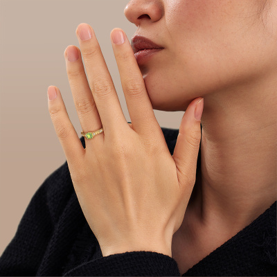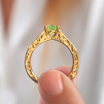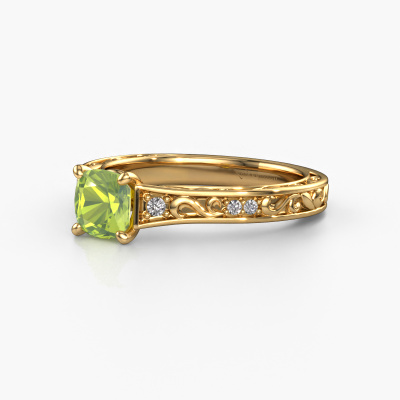 Der oben gezeigte Ring wird Mallory cus genannt. Es ist ein Pavé Solitär Ring, da er einen zentralen Edelstein und ein Band mit Pavé-Fassung hat. Dieser 14 Karat Gold ring ist mit einem 5.5 mm cussion Peridot-Mittelstein besetzt und das Band hat eine Pavé-Fassung mit Diamanten. Jedes Schmuckstück wird von unseren Meister-Goldschmieden in unserem eigenen Studio für Sie gefertigt.Dieser Keltische Gold Pavé Solitär Verlobungsring mit Pavé-Fassung hat einen exquisiten, cussion Peridot als Mittelstein. Um den zentralen Stein noch mehr zu betonen, hat das Band eine Pavé-Fassung mit weiteren Diamanten. Durch die offenen Krappen kann das Licht aus mehreren Winkeln auf den Peridot treffen und der Peridot-Ring funkelt noch mehr. Das obere Foto zeigt die leidenschaftlich handgefertigten Details des Rings. Die hohe Positionierung der Mittelstein ist ein echter Blickfang. Der perfekte Verlobungsring für das Kronjuwel Ihres Lebens!Mit unserer modernen Technik können wir Schmuckstücke von höchster Qualität mit größter Sorgfalt für Sie entwerfen und anpassen. Unsere Verlobungsringe sind immer um 30 Prozent günstiger als bei anderen Juwelieren. Wir fertigen Verlobungsringe auf Bestellung, also müssen wir keine großen Lager unterhalten. Wenn Sie ein bestimmtes Budget haben, beraten wir Sie gerne entsprechend.Verschiedene Arten von neuen Ringen werden täglich von unserem Team angefertigt. Vielleicht haben Sie irgendwo einen Pavé Solitär Verlobungsring gefunden. Einen, den Sie Ihrem Liebsten schenken möchten. Bitte zögern Sie nicht, unseren Schmuckdesignern Ihre Gedanken und Ihr Design zu zeigen. Wir würden gerne Ihr Design in einen Keltische Verlobungsring verwandeln. Sie können die Entwicklungen Ihres Ringdesigns verfolgen, da wir sehr detaillierte 3D-Zeichnungen verwenden. Darüber hinaus können Sie einen Dummy des Designs bestellen. Ein Dummy ist ein Kunststoffring, der nach Ihrem Ringdesign gestaltet werden kann. Sie können ihn anprobieren und prüfen, ob der Verlobungsring Ihren Vorstellungen entspricht. Wir senden Ihnen gerne ein unverbindliches Angebot zu einem fairen Preis/Leistungsverhältnis. Das Angebot wird Sie angesichts der Qualität des Rings und der Edelsteine verblüffen.Um es einfacher zu machen, bieten wir eine kostenlose 30-tägige Rücksendung.