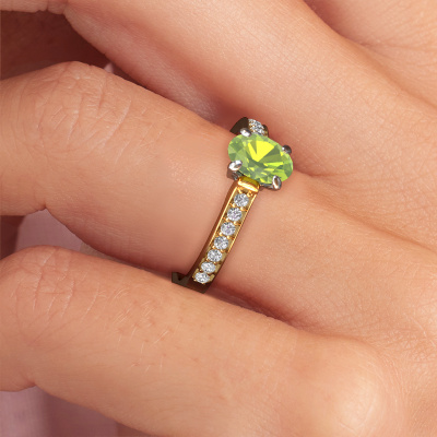 Der oben gezeigte Ring wird Valorie ovl 2 genannt. Es ist ein Pavé Solitär Ring, da er einen zentralen Edelstein und ein Band mit Pavé-Fassung hat. Dieser 14 Karat Gold ring ist mit einem 7x5 mm oval Peridot-Mittelstein besetzt und das Band hat eine Pavé-Fassung mit Lab grown Diamant. Jedes Schmuckstück wird hergestellt mit Leidenschaft und Liebe, von einem unserer Meister-Goldschmiede.Dieser modische Gold Pavé Solitär Verlobungsring mit Pavé-Fassung hat einen exquisiten, oval Peridot als Mittelstein. Um den zentralen Stein noch mehr zu betonen, hat das Band eine Pavé-Fassung mit weiteren Lab grown Diamant. Durch die offenen Krappen kann das Licht aus mehreren Winkeln auf den Peridot treffen und der Peridot-Ring funkelt noch mehr. Das obere Foto zeigt die leidenschaftlich handgefertigten Details des Rings. Die hohe Positionierung der Mittelstein ist ein echter Blickfang. Der perfekte Verlobungsring für das Kronjuwel Ihres Lebens!Haben Sie ein bestimmtes Budget? Sie können uns gerne kontaktieren, damit wir Ihre Optionen besprechen können. Wir bieten unsere Verlobungsringe zum garantiert besten Preis, denn wir fertigen sie auf Bestellung. Solche Preise finden Sie nirgendwo anders!Unser Team fügt unserer Online-Kollektion täglich neue Designs hinzu. Unsere Designer und Goldschmiede arbeiten zusammen, um das beste Design zu kreieren. Wir bemühen uns, eine vielfältige Kollektion von Schmuckstücken anzubieten. Vielleicht haben Sie ein bestimmtes Design im Sinn. Eines, dass Sie irgendwo gesehen haben. Gerne geben wir Ihnen eine kostenlose Beratung. Wir machen Ihnen ein Angebot, basierend auf einem fairen Preis/Leistungsverhältnis, das Sie verblüffen wird.Um es einfacher zu machen, bieten wir eine kostenlose 30-tägige Rücksendung.