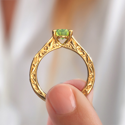 Der oben gezeigte Ring wird Mallory ovl genannt. Es ist ein Pavé Solitär Ring, da er einen zentralen Edelstein und ein Band mit Pavé-Fassung hat. Dieser 14 Karat Gold ring ist mit einem 8x6 mm oval Peridot-Mittelstein besetzt und das Band hat eine Pavé-Fassung mit Lab grown Diamant. Jedes Schmuckstück wird hergestellt mit Leidenschaft und Liebe, von einem unserer Meister-Goldschmiede.Dieser traditionell Gold Pavé Solitär Verlobungsring mit Pavé-Fassung hat einen exquisiten, oval Peridot als Mittelstein. Um den zentralen Stein noch mehr zu betonen, hat das Band eine Pavé-Fassung mit weiteren Lab grown Diamant. Durch die offenen Krappen kann das Licht aus mehreren Winkeln auf den Peridot treffen und der Peridot-Ring funkelt noch mehr. Das obere Foto zeigt die leidenschaftlich handgefertigten Details des Rings. Die hohe Positionierung der Mittelstein ist ein echter Blickfang. Der perfekte Verlobungsring für das Kronjuwel Ihres Lebens!Haben Sie ein bestimmtes Budget? Sie können uns gerne kontaktieren, damit wir Ihre Optionen besprechen können. Wir bieten unsere Verlobungsringe zum garantiert besten Preis, denn wir fertigen sie auf Bestellung. Solche Preise finden Sie nirgendwo anders!Unser Team fügt unserer Online-Kollektion täglich neue Designs hinzu. Unsere Designer und Goldschmiede arbeiten zusammen, um das beste Design zu kreieren. Wir bemühen uns, eine vielfältige Kollektion von Schmuckstücken anzubieten. Vielleicht haben Sie ein bestimmtes Design im Sinn. Eines, dass Sie irgendwo gesehen haben. Gerne geben wir Ihnen eine kostenlose Beratung. Wir machen Ihnen ein Angebot, basierend auf einem fairen Preis/Leistungsverhältnis, das Sie verblüffen wird.Um es einfacher zu machen, bieten wir eine kostenlose 30-tägige Rücksendung.