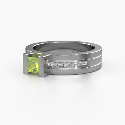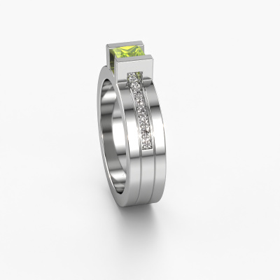 Der oben gezeigte Weißgold Verlobungsring wird Desire genannt. Es ist ein Pavé Solitär Ring, da er einen zentralen Edelstein und ein Band mit Pavé-Fassung hat. Der moderne Pavé Solitär Verlobungsring ist in der Kombination 14 Karat Weißgold mit Weißgold und ist mit einem princess 4 mm Peridot-Mittelstein besetzt und das Band hat eine Pavé-Fassung mit Diamanten. Jedes Schmuckstück wird von unseren Meister-Goldschmieden in unserem eigenen Studio für Sie gefertigt. Um den zentralen Stein noch mehr zu betonen, hat das Band eine Pavé-Fassung mit weiteren Peridot. Durch die offenen Krappen kann das Licht aus mehreren Winkeln auf den Peridot treffen und der Peridot-Ring funkelt noch mehr. Das obere Foto zeigt die leidenschaftlich handgefertigten Details des Rings. Die hohe Positionierung der Mittelstein ist ein echter Blickfang. Der perfekte Verlobungsring für das Kronjuwel Ihres Lebens!Durch die Kombination modernster Technik mit uralter Handwerkskunst können wir alle Verlobungsringe in unserem eigenen Studio anfertigen. Jedes Schmuckstück wird auf Anfrage gefertigt. Das ist vorteilhaft, weil wir Ihnen dadurch einen Preis anbieten können, den Sie nirgendwo anders finden.Haben Sie irgendwo einen bestimmten Verlobungsring gefunden, den Sie Ihrem Liebsten schenken möchten? Sie können uns gerne sagen, was Sie wollen und wir werden Ihr Design in einen Einzigartigen moderne Verlobungsring verwandeln. Sie können die Entwicklungen Ihres Ringdesigns verfolgen, da wir 3D-Zeichnungen verwenden. Das gibt Ihnen eine realistische Vorschau, wie Ihr Design aussehen wird. Sie können auch einen Dummy vorbestellen. Ein Dummy ist ein Kunststoffring, der nach Ihrem Ringdesign gestaltet werden kann. Sie können ihn anprobieren und prüfen, ob seine Breite und Größe für Sie geeignet sind. Wir senden Ihnen gerne ein unverbindliches Angebot zu einem fairen Preis/Leistungsverhältnis. Sie werden in Anbetracht der Qualität des Rings und der Edelsteine überrascht sein.Um es einfacher zu machen, bieten wir eine kostenlose 30-tägige Rücksendung.