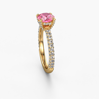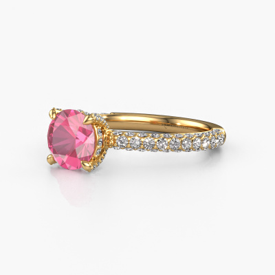 Der oben gezeigte Gold Verlobungsring wird Saskia rnd 2 genannt. Es ist ein Pavé Solitär Ring, da er einen zentralen Edelstein und ein Band mit Pavé-Fassung hat. Der exklusive Pavé Solitär Verlobungsring ist in der Kombination 14 Karat Gold mit Gold und ist mit einem rund 7 mm Pink Saphir-Mittelstein besetzt und das Band hat eine Pavé-Fassung mit Lab grown Diamant. Jedes Schmuckstück wird hergestellt von einem Team leidenschaftlicher Goldschmiede und Schmuckdesigner. Das wird Ihr Kronjuwel unbedingt zu einem Blickfang machen. Um den zentralen Stein noch mehr zu betonen, hat das Band eine Pavé-Fassung mit weiteren Pink Saphir. Durch die offenen Krappen kann das Licht aus mehreren Winkeln auf den Pink Saphir treffen und der Pink Saphir-Ring funkelt noch mehr. Das obere Foto zeigt die leidenschaftlich handgefertigten Details des Rings. Die hohe Positionierung der Mittelstein ist ein echter Blickfang. Der perfekte Verlobungsring für das Kronjuwel Ihres Lebens!Nach Erhalt Ihrer Bestellung beginnen unsere Goldschmiede mit Leidenschaft den kreativen Prozess und fertigen Ihren Verlobungsring in unserem eigenen Studio. Da wir keine großen Lager haben, werden diese Kosten nicht an Sie weitergegeben. Unsere Preisgestaltung ist der Beweis dafür! Wir bieten Schmuck zum niedrigsten Preis, garantiert.Unser Team fügt unserer Online-Kollektion täglich neue Designs hinzu. Unsere Designer und Goldschmiede arbeiten zusammen, um das beste Design zu kreieren. Wir bemühen uns, eine vielfältige Kollektion von Schmuckstücken anzubieten. Vielleicht haben Sie ein bestimmtes Design im Sinn. Eines, dass Sie irgendwo gesehen haben. Gerne geben wir Ihnen eine kostenlose Beratung. Wir machen Ihnen ein Angebot, basierend auf einem fairen Preis/Leistungsverhältnis, das Sie verblüffen wird.Um es einfacher zu machen, bieten wir eine kostenlose 30-tägige Rücksendung.