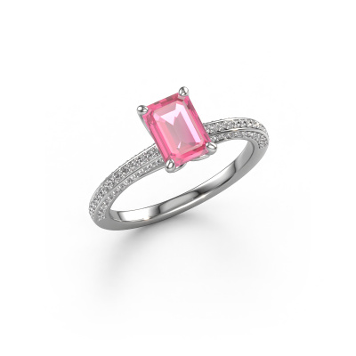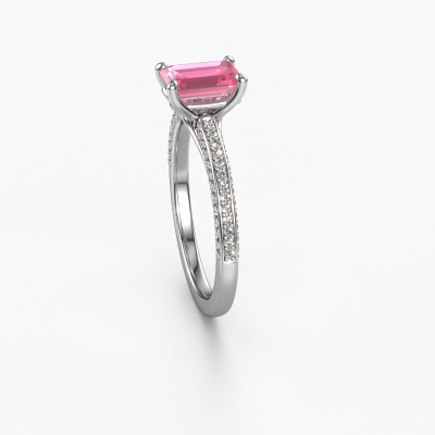 Der oben gezeigte Ring wird Elenore eme genannt. Es ist ein Pavé Solitär Ring, da er einen zentralen Edelstein und ein Band mit Pavé-Fassung hat. Dieser Platin ring ist mit einem 7x5 mm smaragd schliff Pink Saphir-Mittelstein besetzt und das Band hat eine Pavé-Fassung mit Lab grown Diamant. Jedes Schmuckstück wird nur für Sie persönlich hergestellt, mit Liebe zum Detail und Design.Dieser exklusive Platin Pavé Solitär Verlobungsring mit Pavé-Fassung hat einen exquisiten, smaragd schliff Pink Saphir als Mittelstein. Um den zentralen Stein noch mehr zu betonen, hat das Band eine Pavé-Fassung mit weiteren Lab grown Diamant. Durch die offenen Krappen kann das Licht aus mehreren Winkeln auf den Pink Saphir treffen und der Pink Saphir-Ring funkelt noch mehr. Das obere Foto zeigt die leidenschaftlich handgefertigten Details des Rings. Die hohe Positionierung der Mittelstein ist ein echter Blickfang. Der perfekte Verlobungsring für das Kronjuwel Ihres Lebens!Haben Sie ein bestimmtes Budget? Sie können uns gerne kontaktieren, damit wir Ihre Optionen besprechen können. Wir bieten unsere Verlobungsringe zum garantiert besten Preis, denn wir fertigen sie auf Bestellung. Solche Preise finden Sie nirgendwo anders!Haben Sie irgendwo einen bestimmten Verlobungsring gefunden, den Sie Ihrem Liebsten schenken möchten? Sie können uns gerne sagen, was Sie wollen und wir werden Ihr Design in einen Einzigartigen exklusive Verlobungsring verwandeln. Sie können die Entwicklungen Ihres Ringdesigns verfolgen, da wir 3D-Zeichnungen verwenden. Das gibt Ihnen eine realistische Vorschau, wie Ihr Design aussehen wird. Sie können auch einen Dummy vorbestellen. Ein Dummy ist ein Kunststoffring, der nach Ihrem Ringdesign gestaltet werden kann. Sie können ihn anprobieren und prüfen, ob seine Breite und Größe für Sie geeignet sind. Wir senden Ihnen gerne ein unverbindliches Angebot zu einem fairen Preis/Leistungsverhältnis. Sie werden in Anbetracht der Qualität des Rings und der Edelsteine überrascht sein.Um es einfacher zu machen, bieten wir eine kostenlose 30-tägige Rücksendung.