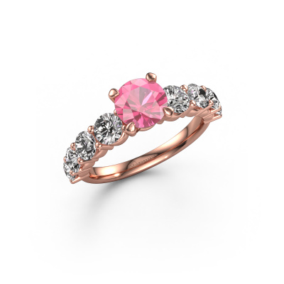 Der oben gezeigte Ring wird Deja genannt. Es ist ein Pavé Solitär Ring, da er einen zentralen Edelstein und ein Band mit Pavé-Fassung hat. Dieser 14 Karat Roségold ring ist mit einem 6.5 mm rund Pink Saphir-Mittelstein besetzt und das Band hat eine Pavé-Fassung mit Lab grown Diamant. Jedes Schmuckstück wird von unseren Meister-Goldschmieden in unserem eigenen Studio für Sie gefertigt.Dieser exklusive Roségold Pavé Solitär Verlobungsring mit Pavé-Fassung hat einen exquisiten, rund Pink Saphir als Mittelstein. Um den zentralen Stein noch mehr zu betonen, hat das Band eine Pavé-Fassung mit weiteren Lab grown Diamant. Durch die offenen Krappen kann das Licht aus mehreren Winkeln auf den Pink Saphir treffen und der Pink Saphir-Ring funkelt noch mehr. Das obere Foto zeigt die leidenschaftlich handgefertigten Details des Rings. Die hohe Positionierung der Mittelstein ist ein echter Blickfang. Der perfekte Verlobungsring für das Kronjuwel Ihres Lebens!Durch die Kombination modernster Technik mit uralter Handwerkskunst können wir alle Verlobungsringe in unserem eigenen Studio anfertigen. Jedes Schmuckstück wird auf Anfrage gefertigt. Das ist vorteilhaft, weil wir Ihnen dadurch einen Preis anbieten können, den Sie nirgendwo anders finden.Unser Team fügt unserer Online-Kollektion täglich neue Designs hinzu. Unsere Designer und Goldschmiede arbeiten zusammen, um das beste Design zu kreieren. Wir bemühen uns, eine vielfältige Kollektion von Schmuckstücken anzubieten. Vielleicht haben Sie ein bestimmtes Design im Sinn. Eines, dass Sie irgendwo gesehen haben. Gerne geben wir Ihnen eine kostenlose Beratung. Wir machen Ihnen ein Angebot, basierend auf einem fairen Preis/Leistungsverhältnis, das Sie verblüffen wird.Um es einfacher zu machen, bieten wir eine kostenlose 30-tägige Rücksendung.