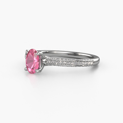 Der oben gezeigte Ring wird Elenore ovl genannt. Es ist ein Pavé Solitär Ring, da er einen zentralen Edelstein und ein Band mit Pavé-Fassung hat. Dieser 14 Karat Weißgold ring ist mit einem 6.5x4.5 mm oval Pink Saphir-Mittelstein besetzt und das Band hat eine Pavé-Fassung mit Diamanten. Jedes Schmuckstück wird hergestellt von einem Team leidenschaftlicher Goldschmiede und Schmuckdesigner. Das wird Ihr Kronjuwel unbedingt zu einem Blickfang machen.Dieser exklusive Weißgold Pavé Solitär Verlobungsring mit Pavé-Fassung hat einen exquisiten, oval Pink Saphir als Mittelstein. Um den zentralen Stein noch mehr zu betonen, hat das Band eine Pavé-Fassung mit weiteren Diamanten. Durch die offenen Krappen kann das Licht aus mehreren Winkeln auf den Pink Saphir treffen und der Pink Saphir-Ring funkelt noch mehr. Das obere Foto zeigt die leidenschaftlich handgefertigten Details des Rings. Die hohe Positionierung der Mittelstein ist ein echter Blickfang. Der perfekte Verlobungsring für das Kronjuwel Ihres Lebens!Nachdem Sie Ihre Bestellung aufgegeben haben, beginnen unsere Goldschmiede mit dem kreativen Prozess der Herstellung Ihres Elenore ovl Verlobungsring. Wir haben keine Lager. Das ist vorteilhaft, da diese Kosten nicht an Sie weitergegeben werden. Daher sind wir in der Lage, Schmuck zu außergewöhnlich niedrigen Preisen anzubieten.Haben Sie irgendwo einen bestimmten Verlobungsring gefunden, den Sie Ihrem Liebsten schenken möchten? Sie können uns gerne sagen, was Sie wollen und wir werden Ihr Design in einen Einzigartigen exklusive Verlobungsring verwandeln. Sie können die Entwicklungen Ihres Ringdesigns verfolgen, da wir 3D-Zeichnungen verwenden. Das gibt Ihnen eine realistische Vorschau, wie Ihr Design aussehen wird. Sie können auch einen Dummy vorbestellen. Ein Dummy ist ein Kunststoffring, der nach Ihrem Ringdesign gestaltet werden kann. Sie können ihn anprobieren und prüfen, ob seine Breite und Größe für Sie geeignet sind. Wir senden Ihnen gerne ein unverbindliches Angebot zu einem fairen Preis/Leistungsverhältnis. Sie werden in Anbetracht der Qualität des Rings und der Edelsteine überrascht sein.Um es einfacher zu machen, bieten wir eine kostenlose 30-tägige Rücksendung.