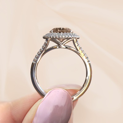 Der oben gezeigte Verlobungsring wird Elvie genannt. Es ist ein Halo Ring, da er einen zentralen Edelstein und ein Band mit Pavé-Fassung hat. Der Platin ring ist mit einem 2.70 crt oval Braun Diamant-Mittelstein besetzt und um ihn herum eine Pavé-Fassung mit Lab grown Diamant. Was diesen Vintage, Platin Pavé Solitär Ring besonders macht, sind die kleineren Steine, die den zentralen Stein umschließen. Dieser wunderschöne Verlobungsring wird als Pavé Solitär Ring bezeichnet, da die kleineren Edelsteine dem zentralen Stein einen Lichthof geben. Damit die kleineren Steine den Mittelstein verstärken, müssen sie so platziert werden, dass keine Lichteinflüsse auftreten. Und hier kommen unsere erfahrenen Goldschmiede ins Spiel. Jeder einzelne Stein wird sorgfältig von Hand in den Ring gesetzt. Während der Herstellung wird der Lichteinfall ständig überprüft. So können wir sicherstellen, dass der spezielle Lichtkranz noch sichtbar ist. Am Ende erhalten Sie einen einzigartigen Verlobungsring mit einem Braune Diamanten Ihrer Wahl in der Mitte. Sie können sich die Wirkung eines solchen Ringes vorstellen, wenn Sie ihn an ihrem besonderen Tag für sie zum Leuchten bringen. Mit unserer modernen Technik können wir Schmuckstücke von höchster Qualität mit größter Sorgfalt für Sie entwerfen und anpassen. Unsere Verlobungsringe sind immer um 30 Prozent günstiger als bei anderen Juwelieren. Wir fertigen Verlobungsringe auf Bestellung, also müssen wir keine großen Lager unterhalten. Wenn Sie ein bestimmtes Budget haben, beraten wir Sie gerne entsprechend.Haben Sie einen bestimmten Ring im Sinn? Eines, dass Sie irgendwo gesehen haben. Bitte zögern Sie nicht, uns zu sagen, was Sie wollen und wir werden Ihr Design in einen Einzigartigen Verlobungsring verwandeln. Sie können die Entwicklungen Ihres Ringdesigns verfolgen, da wir 3D-Zeichnungen verwenden. Das gibt Ihnen eine realistische Vorschau Ihres Designs. Wir senden Ihnen gerne ein unverbindliches Angebot zu einem fairen Preis/Leistungsverhältnis. Es wird Sie erstaunen.Um es einfacher zu machen, bieten wir eine kostenlose 30-tägige Rücksendung.