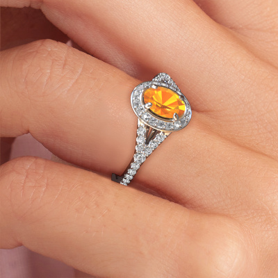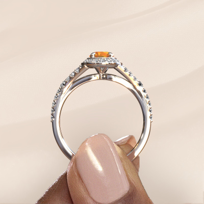 Der oben gezeigte Verlobungsring wird Pamela OVL genannt. Es ist ein Halo Ring, da er einen zentralen Edelstein und ein Band mit Pavé-Fassung hat. Der Platin ring ist mit einem 7x5 mm oval Citrin-Mittelstein besetzt und um ihn herum eine Pavé-Fassung mit Lab grown Diamant. Was diesen Luxus, Platin Halo Ring besonders macht, sind die kleineren Steine, die den zentralen Stein umschließen. Dieser wunderschöne Verlobungsring wird als Halo Ring bezeichnet, da die kleineren Edelsteine dem zentralen Stein einen Lichthof geben. Damit die kleineren Steine den Mittelstein verstärken, müssen sie so platziert werden, dass keine Lichteinflüsse auftreten. Und hier kommen unsere erfahrenen Goldschmiede ins Spiel. Jeder einzelne Stein wird sorgfältig von Hand in den Ring gesetzt. Während der Herstellung wird der Lichteinfall ständig überprüft. So können wir sicherstellen, dass der spezielle Lichtkranz noch sichtbar ist. Am Ende erhalten Sie einen einzigartigen Verlobungsring mit einem Citrin Ihrer Wahl in der Mitte. Sie können sich die Wirkung eines solchen Ringes vorstellen, wenn Sie ihn an ihrem besonderen Tag für sie zum Leuchten bringen. Mit unserer modernen Technik können wir Schmuckstücke von höchster Qualität mit größter Sorgfalt für Sie entwerfen und anpassen. Unsere Verlobungsringe sind immer um 30 Prozent günstiger als bei anderen Juwelieren. Wir fertigen Verlobungsringe auf Bestellung, also müssen wir keine großen Lager unterhalten. Wenn Sie ein bestimmtes Budget haben, beraten wir Sie gerne entsprechend.Unser Team fügt unserer Online-Kollektion täglich neue Designs hinzu. Unsere Designer und Goldschmiede arbeiten zusammen, um das beste Design zu kreieren. Wir bemühen uns, eine vielfältige Kollektion von Schmuckstücken anzubieten. Vielleicht haben Sie ein bestimmtes Design im Sinn. Eines, dass Sie irgendwo gesehen haben. Gerne geben wir Ihnen eine kostenlose Beratung. Wir machen Ihnen ein Angebot, basierend auf einem fairen Preis/Leistungsverhältnis, das Sie verblüffen wird.Um es einfacher zu machen, bieten wir eine kostenlose 30-tägige Rücksendung.