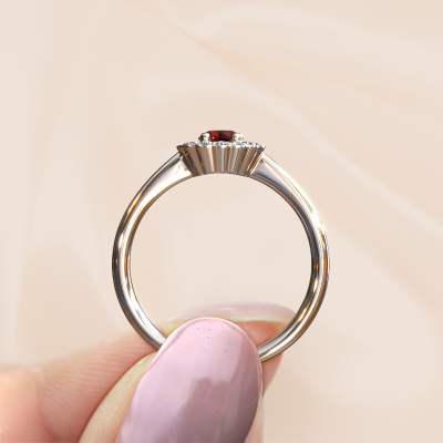 Der oben gezeigte Verlobungsring wird Debi genannt. Es ist ein Halo Ring, da er einen zentralen Edelstein und ein Band mit Pavé-Fassung hat. Der Platin ring ist mit einem 4.2 mm rund Granat-Mittelstein besetzt und um ihn herum eine Pavé-Fassung mit Diamanten. Was diesen klassische, Platin Halo Ring besonders macht, sind die kleineren Steine, die den zentralen Stein umschließen. Dieser wunderschöne Verlobungsring wird als Halo Ring bezeichnet, da die kleineren Edelsteine dem zentralen Stein einen Lichthof geben. Damit die kleineren Steine den Mittelstein verstärken, müssen sie so platziert werden, dass keine Lichteinflüsse auftreten. Und hier kommen unsere erfahrenen Goldschmiede ins Spiel. Jeder einzelne Stein wird sorgfältig von Hand in den Ring gesetzt. Während der Herstellung wird der Lichteinfall ständig überprüft. So können wir sicherstellen, dass der spezielle Lichtkranz noch sichtbar ist. Am Ende erhalten Sie einen einzigartigen Verlobungsring mit einem Granat Ihrer Wahl in der Mitte. Sie können sich die Wirkung eines solchen Ringes vorstellen, wenn Sie ihn an ihrem besonderen Tag für sie zum Leuchten bringen. Da wir unsere eigenen Ringe entwerfen und liefern, können wir Ihnen einen Verlobungsring zu einem Preis anbieten, den Sie nirgendwo anders finden. Ein Ring wird auf Bestellung angefertigt, wodurch kein überschüssiges Material anfällt. So können wir Ihnen ein gutes Angebot zum besten Preis machen. Wir verstehen, dass es sich riskant anfühlt, Ihren Verlobungsring online zu kaufen. Jedoch helfen wir Ihnen gerne beim Designprozess unter Berücksichtigung Ihres Budgets.Unser Team fügt unserer Online-Kollektion täglich neue Designs hinzu. Unsere Designer und Goldschmiede arbeiten zusammen, um das beste Design zu kreieren. Wir bemühen uns, eine vielfältige Kollektion von Schmuckstücken anzubieten. Vielleicht haben Sie ein bestimmtes Design im Sinn. Eines, dass Sie irgendwo gesehen haben. Gerne geben wir Ihnen eine kostenlose Beratung. Wir machen Ihnen ein Angebot, basierend auf einem fairen Preis/Leistungsverhältnis, das Sie verblüffen wird.Um es einfacher zu machen, bieten wir eine kostenlose 30-tägige Rücksendung.