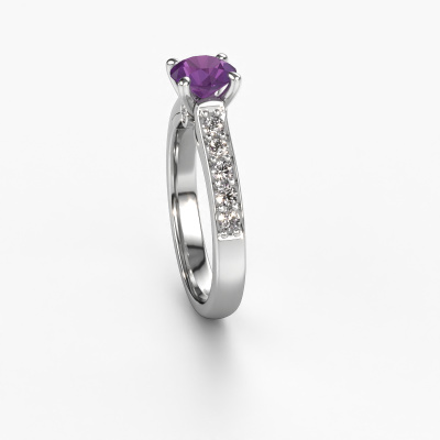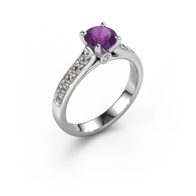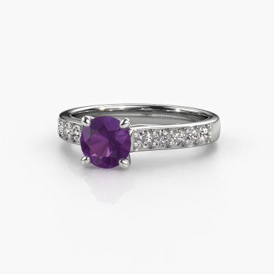 Der oben gezeigte Platin Verlobungsring wird Valorie RND 2 genannt. Es ist ein Pavé Solitär Ring, da er einen zentralen Edelstein und ein Band mit Pavé-Fassung hat. Der moderne Pavé Solitär Verlobungsring ist in der Kombination Platin mit Platin und ist mit einem rund 6.5 mm Amethyst-Mittelstein besetzt und das Band hat eine Pavé-Fassung mit Lab grown Diamant. Jedes Schmuckstück wird nur für Sie persönlich hergestellt, mit Liebe zum Detail und Design. Um den zentralen Stein noch mehr zu betonen, hat das Band eine Pavé-Fassung mit weiteren Amethyst. Durch die offenen Krappen kann das Licht aus mehreren Winkeln auf den Amethyst treffen und der Amethyst-Ring funkelt noch mehr. Das obere Foto zeigt die leidenschaftlich handgefertigten Details des Rings. Die hohe Positionierung der Mittelstein ist ein echter Blickfang. Der perfekte Verlobungsring für das Kronjuwel Ihres Lebens!Mit unserer modernen Technik können wir Schmuckstücke von höchster Qualität mit größter Sorgfalt für Sie entwerfen und anpassen. Unsere Verlobungsringe sind immer um 30 Prozent günstiger als bei anderen Juwelieren. Wir fertigen Verlobungsringe auf Bestellung, also müssen wir keine großen Lager unterhalten. Wenn Sie ein bestimmtes Budget haben, beraten wir Sie gerne entsprechend.Unsere Designer und Goldschmiede arbeiten jeden Tag zusammen und versuchen, neue Schmuckstücke zu kreieren. Vielleicht haben Sie irgendwo einen schönen, moderne Verlobungsring gefunden, nach dem Ihr einzigartiger Ring gestaltet werden kann. Setzen Sie sich mit uns in Verbindung. Wir machen Ihnen ein Angebot, basierend auf einem fairen Preis/Leistungsverhältnis, das Sie begeistern wird.Um es einfacher zu machen, bieten wir eine kostenlose 30-tägige Rücksendung.